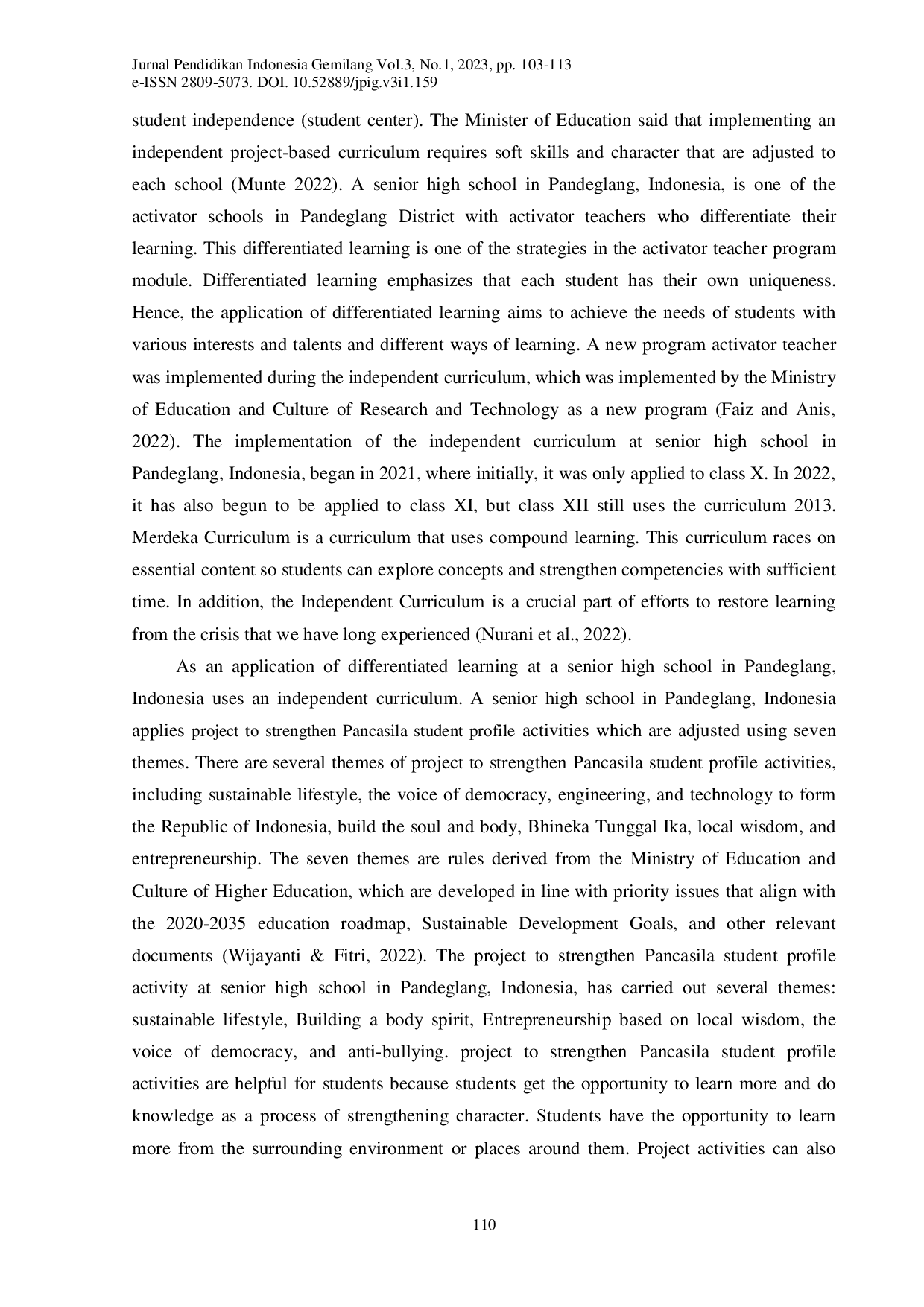 Jurnal Pendidikan Indonesia GemilangJurnal Pendidikan Indonesia GemilangPenelitian ini bertujuan untuk mengetahui pelaksanaan proyek untuk memperkuat profil pelajar Pancasila sebagai proyek untuk memperkuat profil pelajar Pancasila di sebuah SMA di Kabupaten Pandeglang, Indonesia, serta dampak pelaksanaannya terhadap siswa. Prosedur yang digunakan dalam penelitian ini adalah metode kualitatif dengan pendekatan deskriptif. Metode pengumpulan data yang digunakan adalah wawancara dan kuesioner. Wawancara dilakukan dengan tujuh responden, yaitu guru di SMA di Kabupaten Pandeglang, Indonesia, yang merupakan fasilitator dalam melaksanakan kurikulum mandiri di kelas, serta siswa kelas X dan XI sebagai peserta dalam kegiatan proyek untuk memperkuat profil pelajar Pancasila. Siswa diharuskan melakukan proyek untuk menerapkan kurikulum mandiri. Kegiatan proyek dalam kurikulum mandiri, salah satunya adalah dengan melaksanakan proyek untuk memperkuat kegiatan profil pelajar Pancasila. Hasil proyek yang akan ditampilkan dalam pameran proyek untuk memperkuat profil pelajar Pancasila di SMA di Kabupaten Pandeglang, Indonesia, meliputi (1) Poster; (2) Papan buletin; (3) Buku saku demokrasi; (4) Praktik terbaik anti-bullying. Sebuah SMA di Kabupaten Pandeglang, Indonesia, termasuk dalam sekolah penggerak dengan guru penggerak, menjadikan pembelajaran yang berbeda sebagai strategi dalam kegiatan program guru penggerak.