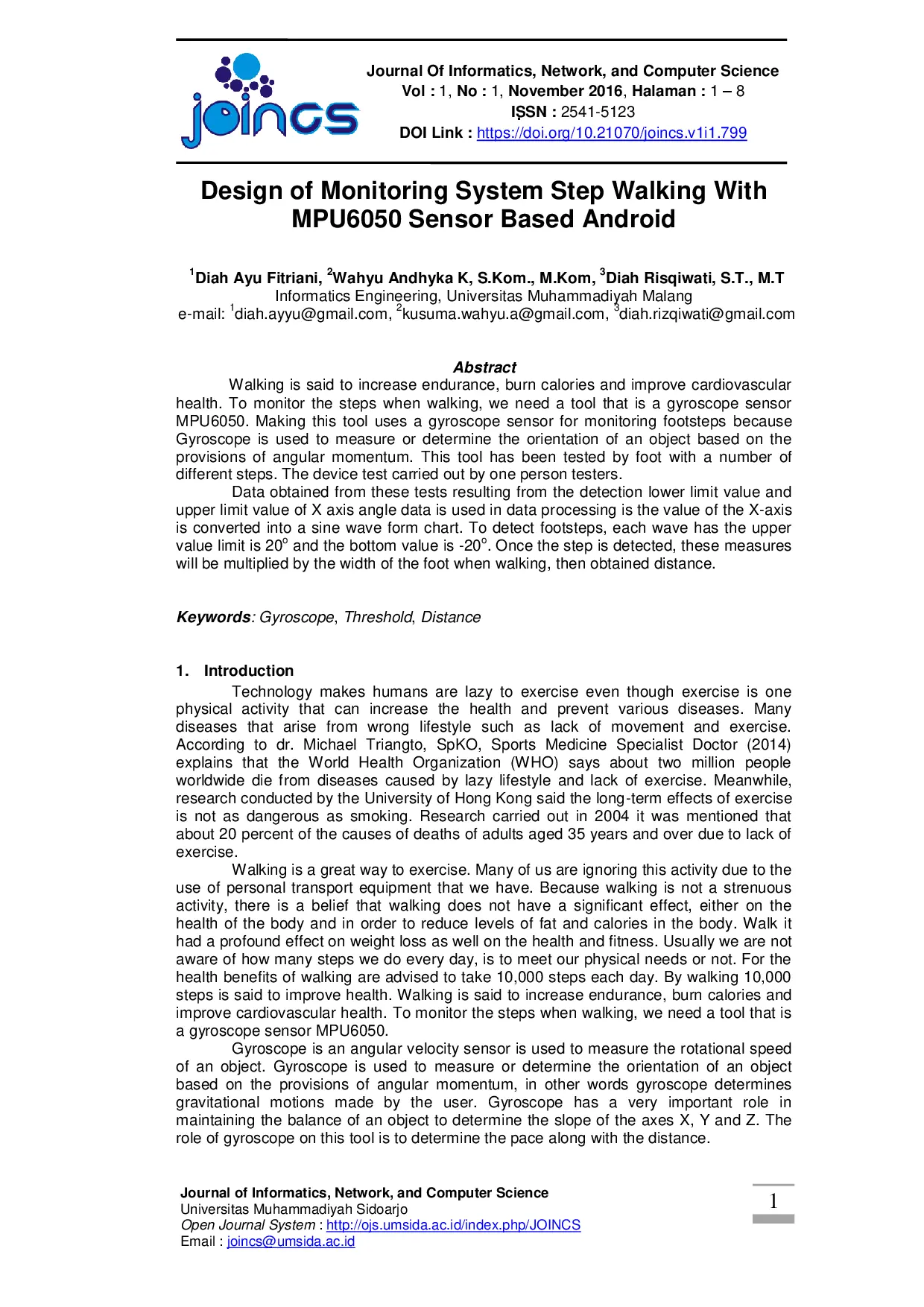 JOINCS (Journal of Informatics, Network, and Computer Science)JOINCS (Journal of Informatics, Network, and Computer Science)Berjalan dikatakan dapat meningkatkan daya tahan tubuh, membakar kalori, dan meningkatkan kesehatan kardiovaskular. Untuk memantau langkah saat berjalan, diperlukan alat yang menggunakan sensor giroskop MPU6050. Pembuatan alat ini menggunakan sensor giroskop untuk pemantauan langkah kaki karena giroskop digunakan untuk mengukur atau menentukan orientasi suatu objek berdasarkan ketentuan momentum sudut. Alat ini telah diuji coba dengan kaki dengan jumlah langkah yang berbeda. Pengujian alat dilakukan oleh satu orang penguji. Data yang diperoleh dari pengujian ini menghasilkan dari deteksi nilai batas bawah dan nilai batas atas data sudut sumbu X yang digunakan dalam pengolahan data, nilai sumbu X dikonversi ke dalam bentuk grafik gelombang sinus. Untuk mendeteksi langkah kaki, setiap gelombang memiliki nilai batas atas 20° dan nilai bawah -20°. Setelah langkah terdeteksi, pengukuran ini akan dikalikan dengan lebar kaki saat berjalan, kemudian diperoleh jarak.