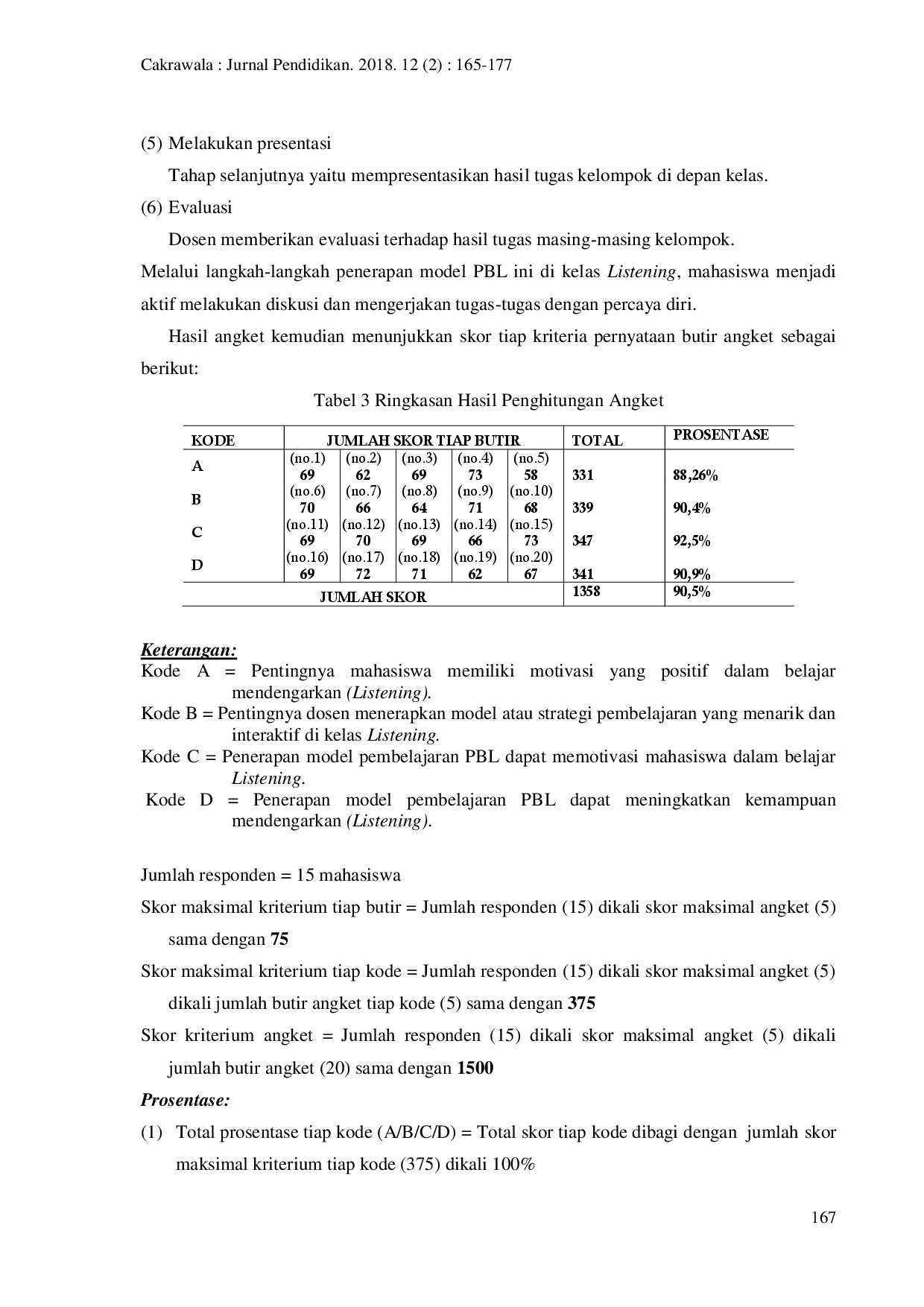 Model PBL ini dapat diterapkan di kelas Listening dengan langkah-langkah sebagai berikut.(1) dosen menetapkan topik dan subtopik bahasan, (2) dosen meminta mahasiswa untuk membuat kelompok yang terdiri dari dua atau empat orang, (3) mahasiswa mengerjakan tugas-tugas melalui.media powerpoint, video, recording dan gambar dengan didampingi dosen, (4) mahasiswa merencanakan presentasi, (5) mahasiswa melakukan presentasi, dan (6) dosen mengevaluasi hasil tugas mahasiswa.Hasil angket (lihat gambar 1) menujukkan skor 1358 yaitu berada ditengah-tengah setuju dan sangat setuju, maka dapat disimpulkan tingkat persetujuan terhadap model pembelajaran PBL efektif diterapkan di kelas Listening yaitu sebesar 90,5% dari yang diharapkan (100%).