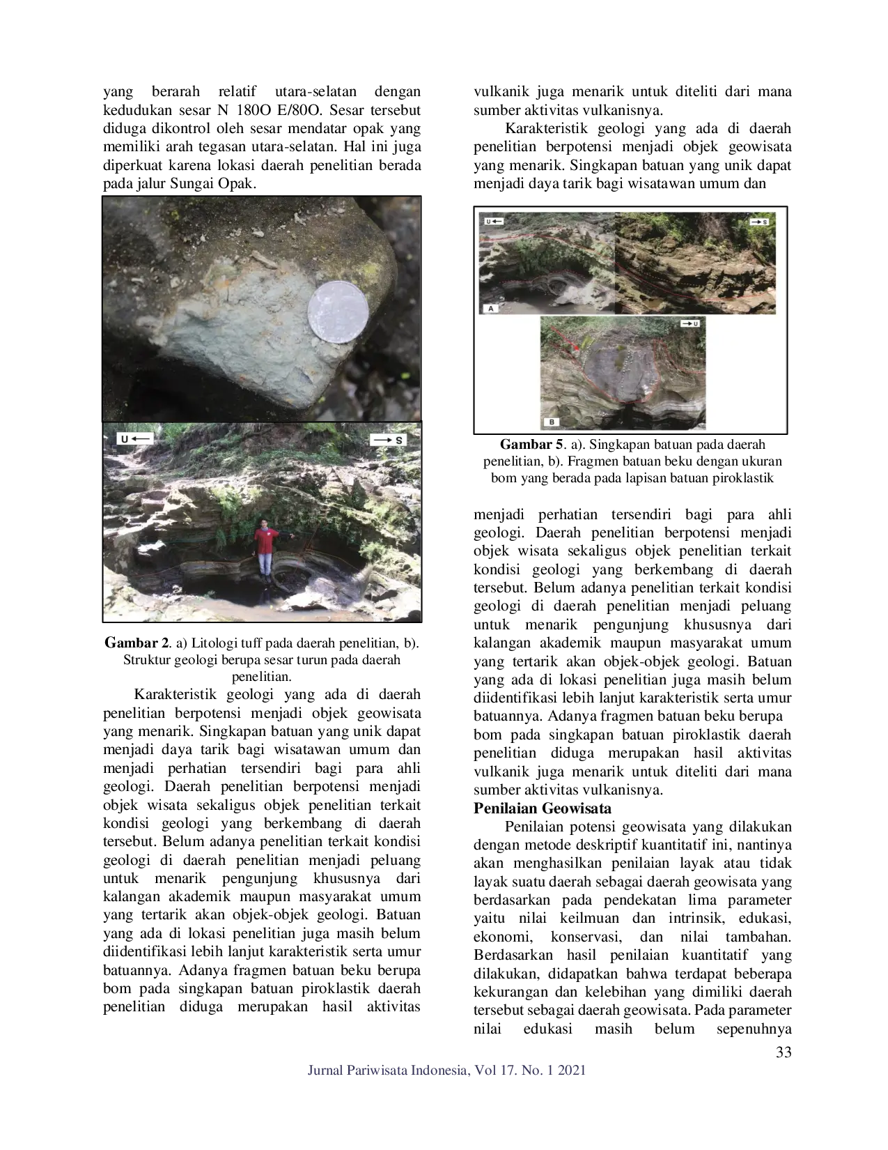 Jurnal Pariwisata IndonesiaJurnal Pariwisata IndonesiaDesa Sitimulyo dikenal publik sebagai destinasi wisata Watu Kapal. Objek Watu Kapal memiliki daya tarik luar biasa dan potensi untuk dikembangkan menjadi geowisata berdasarkan karakteristik geologi, sosial‑kultural, nilai pendidikan, konservasi, serta ekonomi kreatif masyarakat. Penelitian ini bertujuan mengidentifikasi potensi Watu Kapal sebagai objek pengembangan geowisata. Metode yang digunakan berupa survei lapangan, deskripsi kualitatif dan kuantitatif pada lokasi penelitian. Penilaian dilakukan dengan mengacu pada Kubalikova (2013). Hasil penelitian menghasilkan nilai 63,5 %, yang menunjukkan bahwa objek Watu Kapal berpotensi untuk dikembangkan menjadi objek geowisata. Untuk pengembangan objek geowisata yang lebih optimal, diperlukan penelitian lanjutan dan pembangunan infrastruktur.