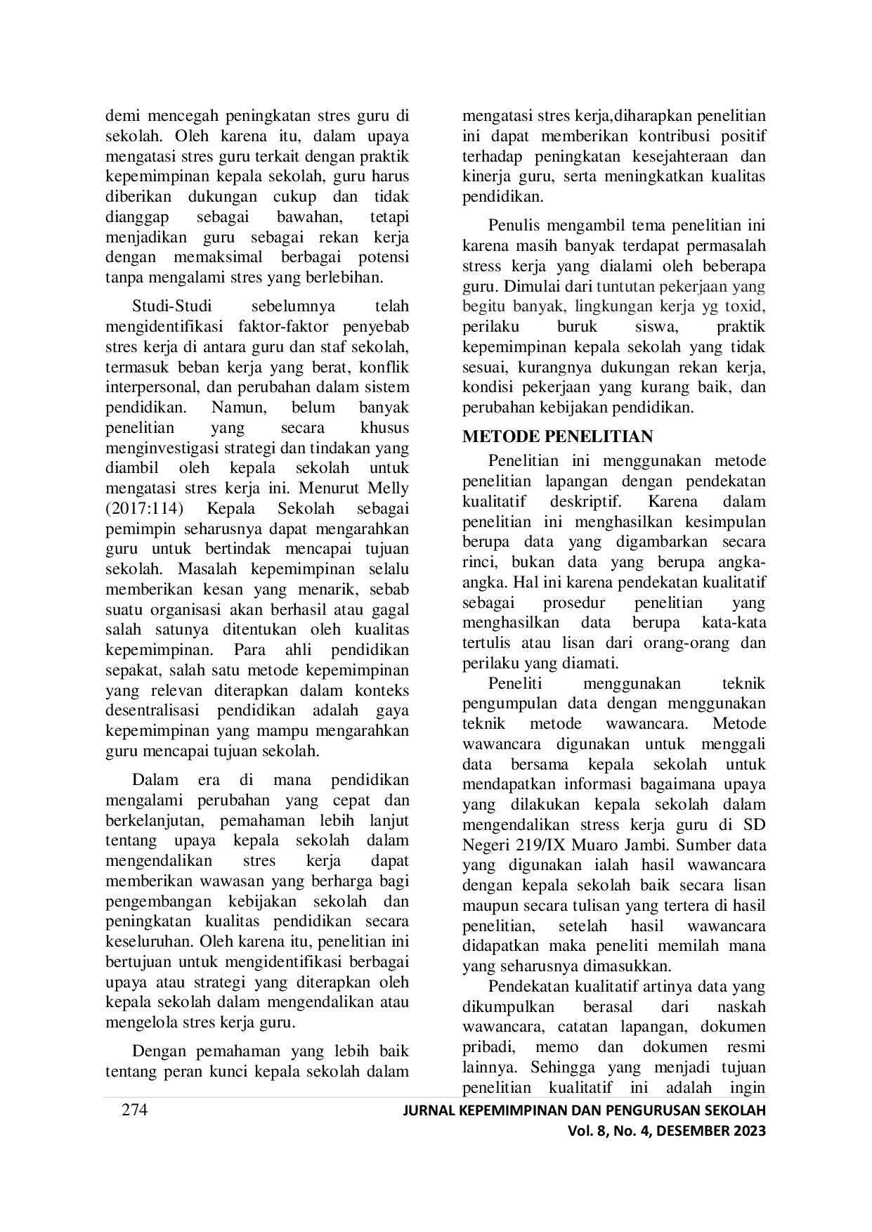 Dari hasil penelitian dapat disimpulkan bahwa penyebab stres kerja guru meliputi masalah pribadi, kesehatan guru, perilaku siswa, dan materi pelajaran yang sulit.Kepala sekolah menerapkan strategi berupa bimbingan psikologis, program panduan penanganan stres, identifikasi faktor stres, pelatihan profesional bulanan, serta pertemuan harian guru untuk laporan perkembangan siswa.Upaya tersebut bertujuan mengendalikan stres guru dan meningkatkan kualitas pendidikan di sekolah.