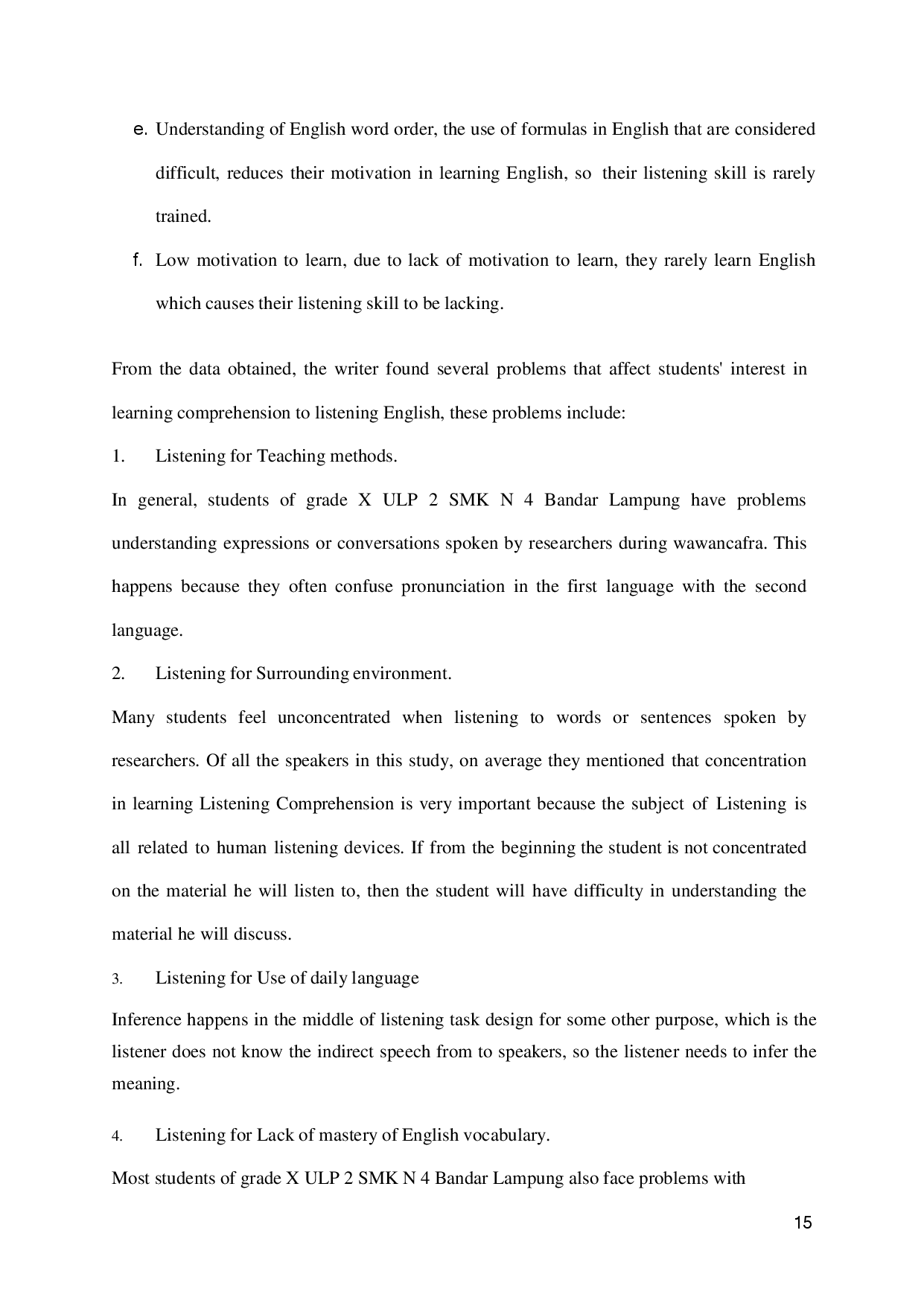 Journal Lingua CendikiaJournal Lingua CendikiaTujuan penelitian ini adalah mengidentifikasi permasalahan siswa dalam pemahaman mendengarkan di kelas X ULP 2 SMK N 4 Bandar Lampung. Penelitian ini menggunakan pendekatan kualitatif melalui deskripsi dan analisis data yang diperoleh dari wawancara sebagai sumber data utama dan dokumentasi sebagai sumber data sekunder. Hasil penelitian menunjukkan bahwa permasalahan peningkatan pemahaman mendengarkan siswa dipengaruhi oleh metode pengajaran, lingkungan sekitar, penggunaan bahasa sehari-hari, ketidaktahuan kosakata bahasa Inggris, pemahaman kata Bahasa Inggris, dan motivasi belajar yang rendah. Penemuan tersebut menegaskan bahwa minat siswa dalam tugas pemahaman mendengarkan berkurang karena faktor-faktor di atas. Kata kunci: Bahasa Inggris, Pemahaman Mendengarkan.