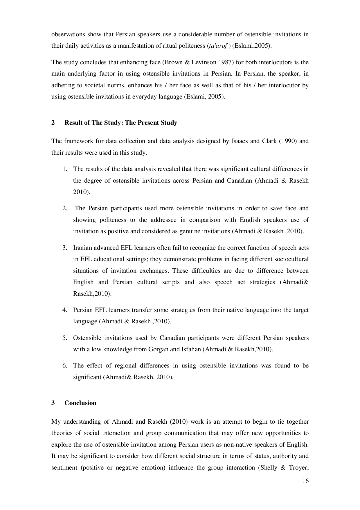Pemahaman saya terhadap karya Ahmadi dan Rasekh (2010) merupakan upaya awal untuk menghubungkan teori interaksi sosial dan komunikasi kelompok yang dapat menawarkan peluang baru untuk mengeksplorasi penggunaan invitasi ostensible di antara penutur Persia sebagai penutur non-natif bahasa Inggris.Perbedaan ilocutionary dalam menggunakan ostensible invitations di antara bilingual dan non-native speakers dapat dianalisis lebih lanjut dengan mengintegrasikan variabel sosial seperti status dan yolasi.Selain itu, metodologi ideal harus menggabungkan observasi etnografi dan respons yang dihasilkan untuk mendapatkan pemahaman yang lebih komprehensif tentang kompleksitas tindak tutur ostensible.