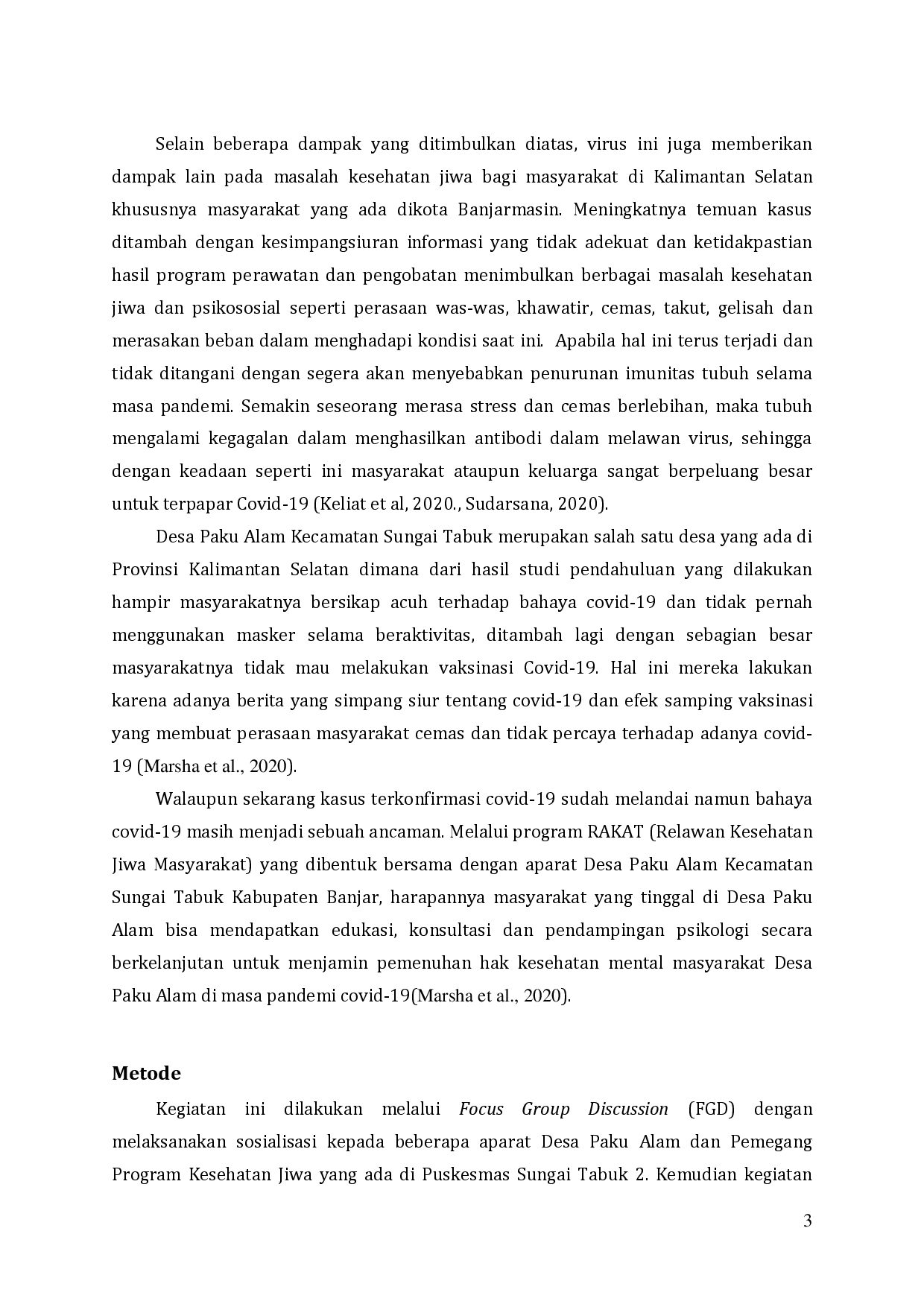 Perawat Mengabdi (Jurnal Pengabdian Kepada Masyarakat)Perawat Mengabdi (Jurnal Pengabdian Kepada Masyarakat)Banyak kasus terkonfirmasi covid-19 di wilayah Provinsi Kalimantan Selatan membuat pemerintahan pemberlakukan social distancing dan physical distancing (PKKM Level 4). Semua aktivitas seperti bekerja, belajar, ibadah sehingga sekolah dilakukan secara online. Hal tersebut sangat menimbulkan berbagai macam dampak yang merugikan, seperti halnya permasalahan kesehatan jiwa. Meningkatnya temuan kasus yang terkonfirmasi positif covid-19 ditambah dengan adanya kesimpangsiuran informasi yang tidak adekuat serta ketidakpastian hasil program perawatan dan pengobatan menyebabkan masyarakat memiliki perasaan was-was, khawatir, cemas, takut, gelisah dan merasakan beban dalam menghadapi kondisi saat ini. Apabila hal ini terus terjadi dan tidak ditangani dengan cara yang tepat dan cepat akan menyebabkan penurunan imunitas fisik dan jiwa selama masa pandemi. Kondisi seperti ini membuat masyarakat harus mencari solusi untuk mengatasi masalah yang dialami. Metode yang digunakan dengan pendekatan Focus Group Discussion (FGD), sosialisasi program Rakat Jiwa, pemilihan Relawan Kesehatan Jiwa, penjelasan tugas dan peran relawan Keswa melalui pelatihan yang diberikan oleh tim Kesehatan Jiwa. Hasil dari kegiatan ini terbentuknya relawan kesehatan jiwa yang peduli dan tanggap terhadap permasalahan kesehatan jiwa yang ada di wilayah desanya. Kesimpulan dari kegiatan ini berhasil memberikan dampak positif dalam hal peningkatan pengetahuan relawan tentang kesehatan jiwa dan penanganan stress selama masa pandemi Covid-19.