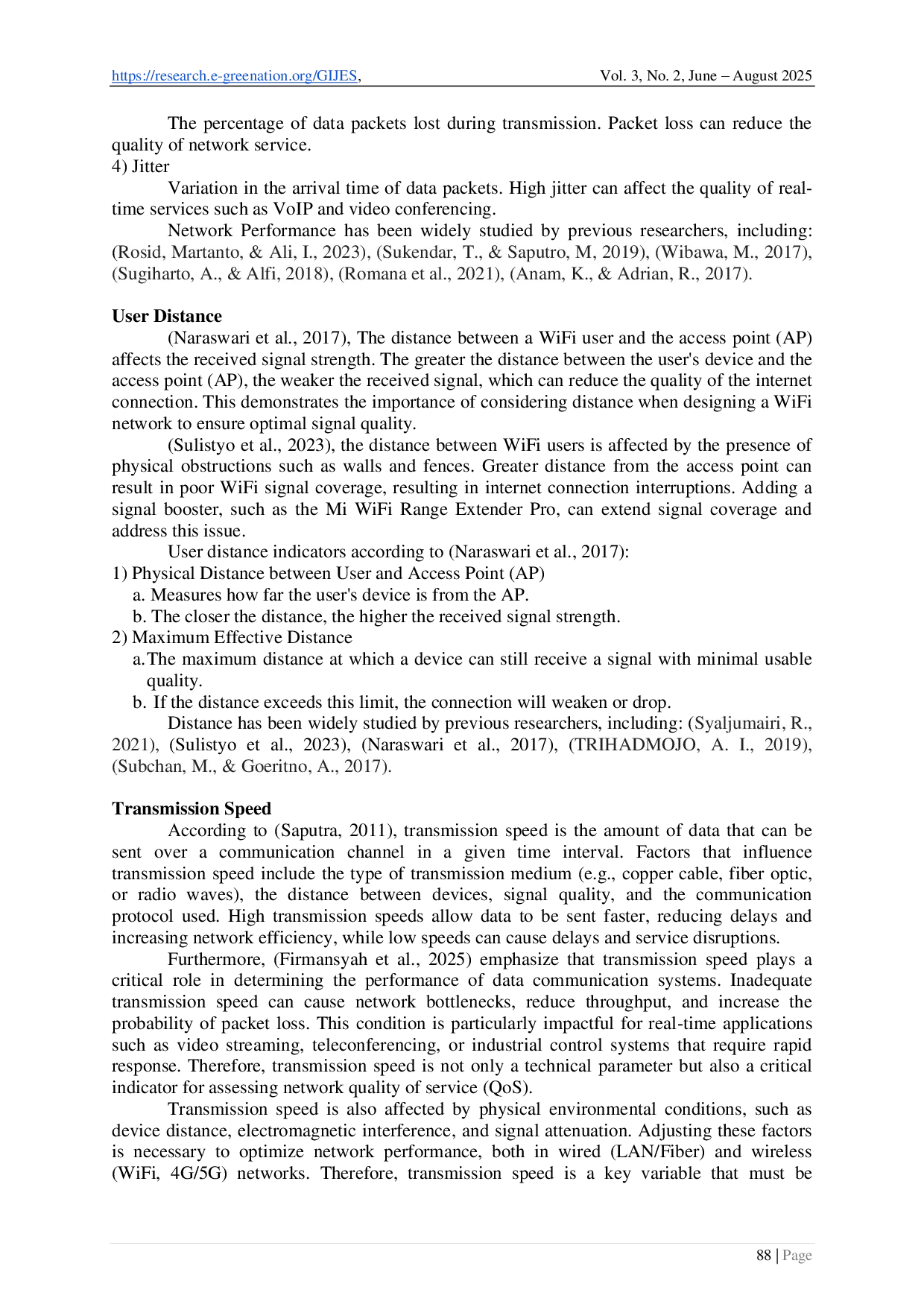 Greenation International Journal of Engineering ScienceGreenation International Journal of Engineering ScienceAbstrak: Penelitian ini merupakan sebuah artikel ilmiah yang bertujuan untuk menganalisis pengaruh jarak pengguna dan kecepatan transmisi terhadap kinerja jaringan komunikasi data. Metode kualitatif dengan pendekatan fenomenologis digunakan, yang menekankan deskripsi pengalaman hidup subjek dari perspektif partisipan. Hasil penelitian menunjukkan bahwa jarak pengguna memengaruhi kinerja jaringan komunikasi data, serta kecepatan transmisi juga berdampak pada kinerja jaringan. Selain dua variabel eksogen ini, variabel endogen kualitas sinyal dipengaruhi oleh faktor lain seperti jaringan LAN, hambatan komunikasi, dan stabilitas koneksi.