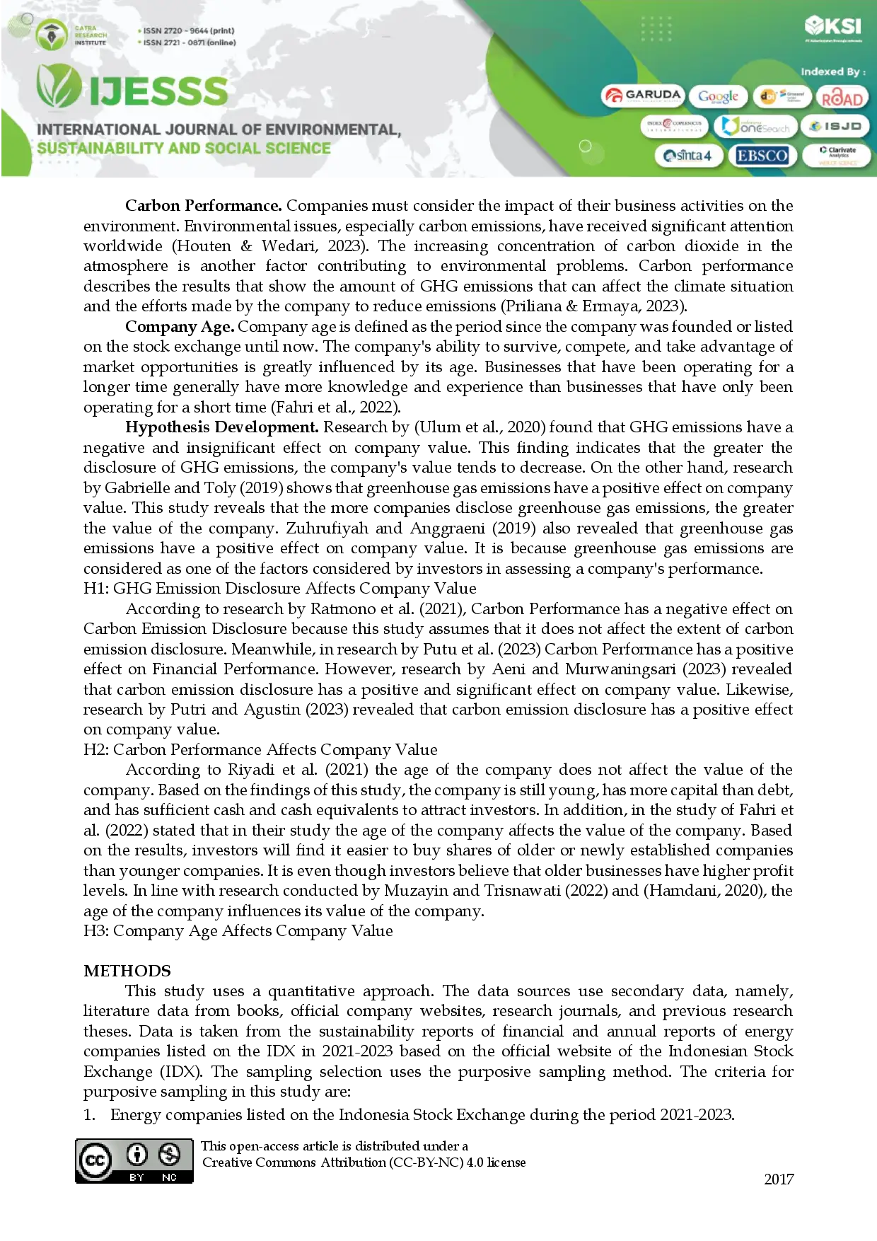 International Journal of Environmental, Sustainability, and Social ScienceInternational Journal of Environmental, Sustainability, and Social SciencePenelitian ini bertujuan untuk menguji pengaruh Pengungkapan Emisi Gas Rumah Kaca (GRK), Kinerja Karbon, dan Umur Perusahaan terhadap Nilai Perusahaan. Data yang digunakan adalah data sekunder yang diperoleh dari Bursa Efek Indonesia berupa laporan keuangan, laporan tahunan, dan laporan keberlanjutan perusahaan. Teknik pengambilan sampel menggunakan pendekatan purposive sampling, yaitu dengan metode pengambilan sampel berdasarkan kriteria tertentu yang ditetapkan oleh peneliti. Teknik analisis data dilakukan menggunakan analisis regresi berganda dengan aplikasi SPSS 29.0. Penelitian ini menggunakan perusahaan sektor energi yang terdaftar di Bursa Efek Indonesia periode 2021-2023, dengan total 86 sampel. Hasil pengujian hipotesis menunjukkan bahwa Pengungkapan Emisi GRK dan Umur Perusahaan tidak memengaruhi Nilai Perusahaan. Sementara itu, Kinerja Karbon memengaruhi Nilai Perusahaan. Pengungkapan emisi GRK tidak secara langsung memengaruhi nilai perusahaan karena investor lebih menghargai profitabilitas dan pertumbuhan. Namun, pengelolaan emisi karbon yang efektif meningkatkan reputasi dan menarik investasi. Umur perusahaan juga menentukan nilai melalui inovasi dan adaptasi pasar, serta mendukung pertumbuhan.