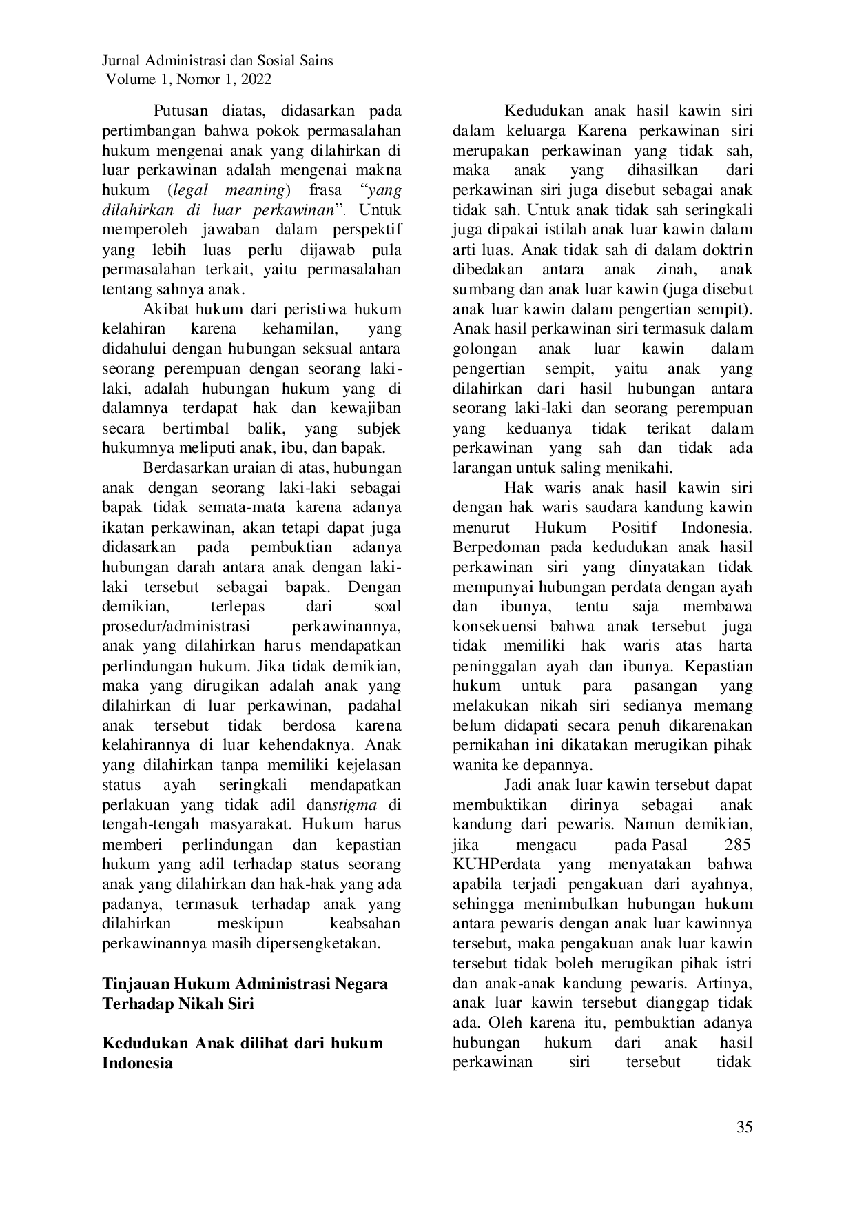 JASSJASSUndang-Undang Nomor 1 Tahun 1974 tentang Perkawinan menyatakan bahwa perkawinan dikatakan sah jika dicatatkan sesuai ketentuan Pasal 2 ayat (2), sehingga nikah siri dianggap tidak sah karena tidak memenuhi unsur tersebut. Akibat hukumnya, akte kelahiran anak dari nikah siri tidak dapat dikeluarkan karena pernikahan tidak resmi menurut hukum positif Indonesia. Menurut Hukum Islam, nikah siri sah jika telah memenuhi syarat dan rukun nikah serta dilaksanakan menurut hukum masing-masing agama, sebagaimana diatur dalam Pasal 2 ayat (1) Undang-Undang Nomor 1 Tahun 1974 dan Pasal 4 Kompilasi Hukum Islam. Sebelum Putusan MK No 46/PUU-VIII/2010, anak dari hasil nikah siri hanya memiliki hubungan perdata dengan ibu dan keluarga ibunya. Setelah adanya putusan tersebut, anak juga dapat memiliki hubungan perdata dengan ayahnya jika mendapat pengakuan dari ayah biologis atau dibuktikan melalui ilmu pengetahuan dan teknologi.