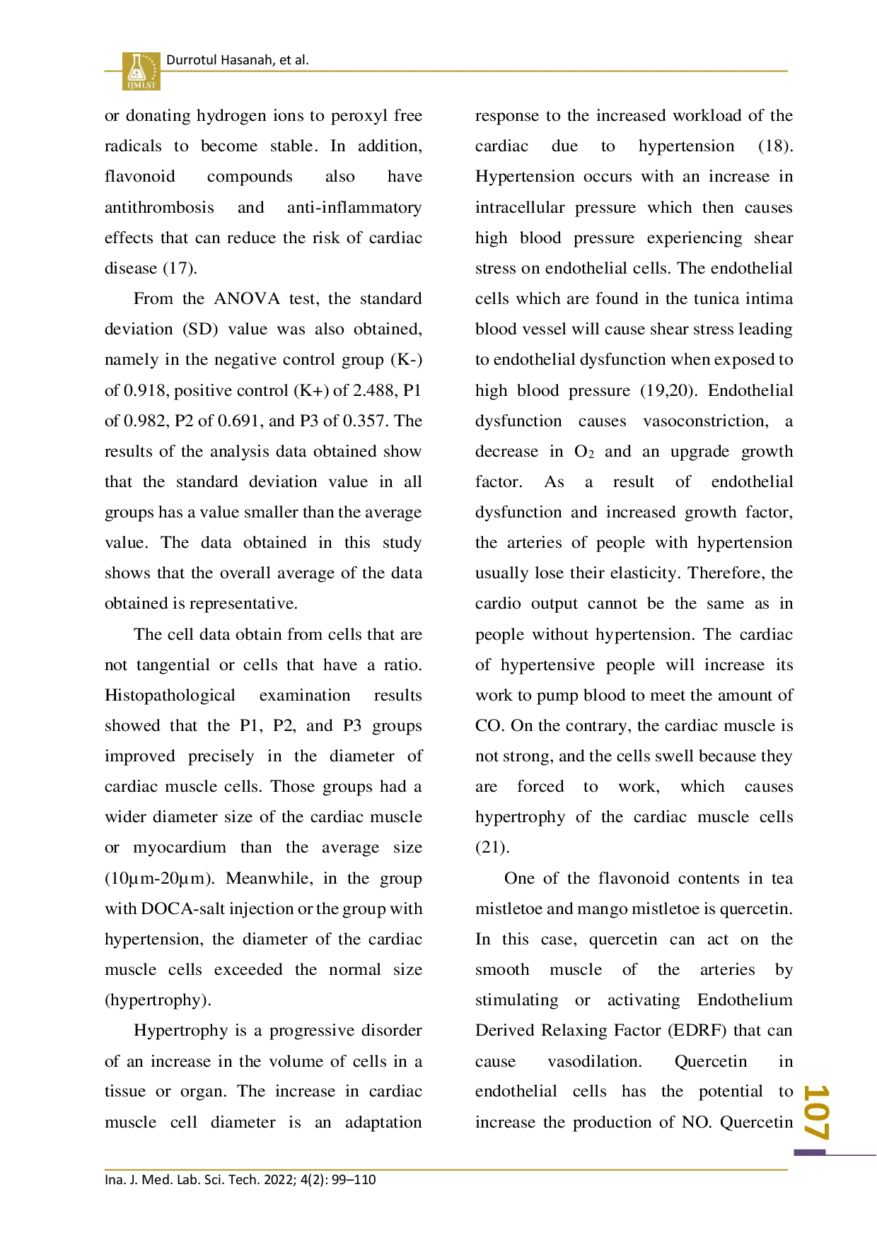 Penelitian ini menunjukkan bahwa pemberian ekstrak kombinasi methanolic daun benalu teh dan benalu mangga pada tikus wistar jantan dengan model hipertensi preventif secara signifikan dapat mencegah peningkatan diameter sel otot jantung.Dosis yang digunakan dalam penelitian ini tidak menunjukkan perbedaan signifikan.Efek ini dikendalikan oleh ekstrak kombinasi methanolic daun benalu teh dan benalu mangga pada dosis 50 mg/KgBB yang merupakan dosis optimal dalam mengurangi diameter sel otot jantung pada tikus wistar jantan.Hasil penelitian ini mengindikasikan potensi pemanfaatan ekstrak kombinasi daun benalu teh dan benalu mangga sebagai bahan baku herbal dalam bidang fitofarmakologi.