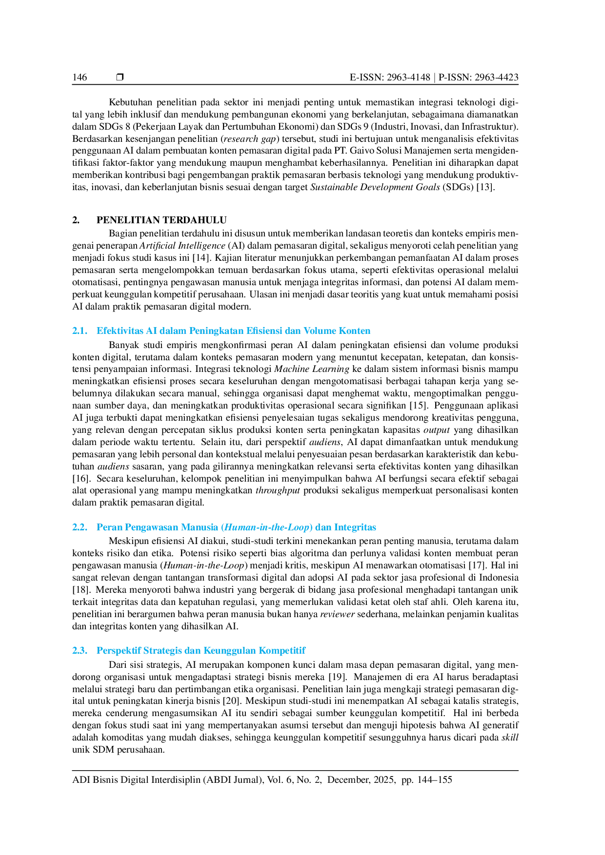 ADI Bisnis Digital Interdisiplin JurnalADI Bisnis Digital Interdisiplin JurnalPenerapan Artificial Intelligence (AI) dalam pemasaran digital telah menjadi pendorong utama efisiensi bisnis, namun implikasi strategis dan peran manusia di dalamnya masih memerlukan kajian mendalam. Penelitian studi kasus kualitatif ini bertujuan menganalisis efektivitas adopsi AI generatif (Gemini AI dan Claude AI) dalam proses pembuatan konten di PT. Gaivo Solusi Manajemen, dengan fokus pada perceived usefulness, peran human-in-the-loop, dan perspektif keunggulan kompetitif. Data dikumpulkan melalui wawancara semistruktur dengan informan kunci dan dianalisis menggunakan Analisis Tematik. Hasil penelitian menunjukkan bahwa AI meningkatkan efisiensi proses secara substansial, terutama dalam penyusunan draf konten dan Meta package SEO, yang meningkatkan volume dan kecepatan produksi. Namun, temuan kunci menegaskan bahwa AI hanyalah alat bantu dan memerlukan pengawasan wajib oleh staf ahli (human-in-the-loop) untuk menjamin integritas informasi dan kualitas yang sesuai dengan regulasi industri jasa profesional. Secara strategis, AI tidak dianggap sebagai sumber keunggulan kompetitif yang sulit ditiru (bersifat komoditas), melainkan sebagai enabler. Keunggulan kompetitif yang sesungguhnya terletak pada kemampuan staf dalam prompt engineering yang didukung oleh data internal perusahaan yang relevan. Studi ini memberikan kontribusi manajerial dengan merekomendasikan fokus investasi pada pengembangan skill sumber daya manusia alih-alih pada akuisisi alat AI semata.