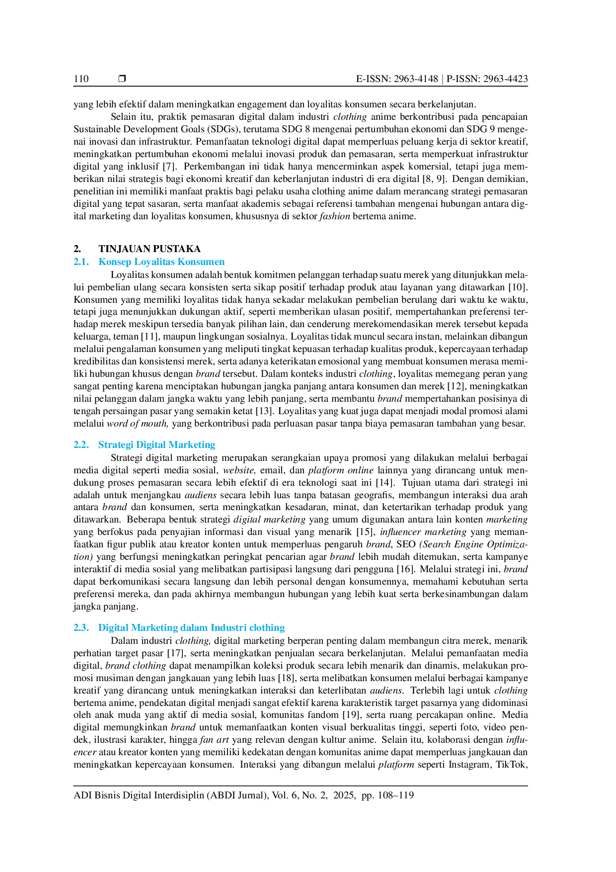 ADI Bisnis Digital Interdisiplin JurnalADI Bisnis Digital Interdisiplin JurnalDalam industri fashion, khususnya pada sektor brand clothing bertema anime, membangun loyalitas konsumen menjadi tantangan penting untuk memastikan pertumbuhan jangka panjang sekaligus mendukung prinsip keberlanjutan yang selaras dengan Sustainable Development Goals (SDGs), terutama SDGs 8 dan SDGs 12. Penelitian ini bertujuan untuk menganalisis berbagai pendekatan digital marketing yang dapat meningkatkan loyalitas konsumen terhadap brand clothing anime dengan menelaah bagaimana interaksi digital, identitas visual, dan keterlibatan komunitas berkontribusi pada terciptanya hubungan yang kuat antara brand dan konsumen. Penelitian ini menggunakan pendekatan deskriptif kualitatif yang diperkuat oleh data observasi dari aktivitas media sosial, dokumentasi berbagai kampanye digital, serta interpretasi pola keterlibatan konsumen di berbagai platform digital. Hasil penelitian menunjukkan bahwa strategi seperti pemanfaatan media sosial untuk memperkuat kehadiran brand, kolaborasi dengan influencer anime, penggunaan konten berbasis komunitas, serta personalisasi melalui email marketing dan program loyalitas terbukti efektif meningkatkan keterikatan emosional dan loyalitas perilaku konsumen. Brand yang mampu menciptakan pengalaman digital yang menarik secara emosional dan berinteraksi secara autentik dengan audiensnya memiliki potensi lebih besar dalam membangun loyalitas yang berkelanjutan. Selain itu, konsistensi komunikasi brand, keberlanjutan kampanye pemasaran, dan integrasi nilai-nilai yang berorientasi pada SDGs menjadi komponen penting dalam memelihara hubungan jangka panjang dengan konsumen. Penelitian ini menyimpulkan bahwa digital marketing tidak hanya memperkuat visibilitas brand, tetapi juga berperan strategis dalam membentuk perilaku konsumen yang lebih bertanggung jawab, mendorong loyalitas dalam komunitas fashion berbasis anime, dan mendukung pencapaian tujuan keberlanjutan dalam industri fashion.