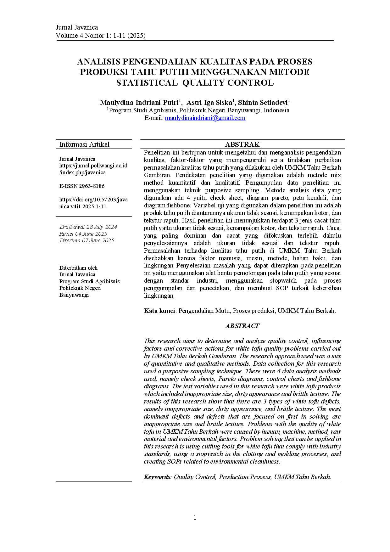 Jurnal JavanicaJurnal JavanicaPenelitian ini bertujuan untuk mengetahui dan menganalisis pengendalian kualitas, faktor‑faktor yang mempengaruhi serta tindakan perbaikan permasalahan kualitas tahu putih yang dilakukan oleh UMKM Tahu Berkah Gambiran. Pendekatan penelitian yang digunakan adalah metode mix method kuantitatif dan kualitatif. Pengumpulan data penelitian ini menggunakan teknik purposive sampling. Metode analisis data yang digunakan ada empat, yaitu check sheet, diagram Pareto, peta kendali, dan diagram fishbone. Variabel uji yang digunakan dalam penelitian ini adalah produk tahu putih, yaitu ukuran tidak sesuai, kenampakan kotor, dan tekstur rapuh. Hasil penelitian ini menunjukkan terdapat tiga jenis cacat tahu putih, yaitu ukuran tidak sesuai, kenampakan kotor, dan tekstur rapuh. Cacat yang paling dominan dan yang difokuskan penyelesaiannya adalah ukuran tidak sesuai, tekstur rapuh, dan kenampakan kotor. Permasalahan terhadap kualitas tahu putih di UMKM Tahu Berkah disebabkan oleh faktor manusia, mesin, metode, bahan baku, dan lingkungan. Penyelesaian yang dapat diterapkan adalah penggunaan alat bantu pemotongan yang sesuai, penggunaan stopwatch pada proses penggumpalan dan pencetakan, serta pembuatan SOP terkait kebersihan lingkungan.