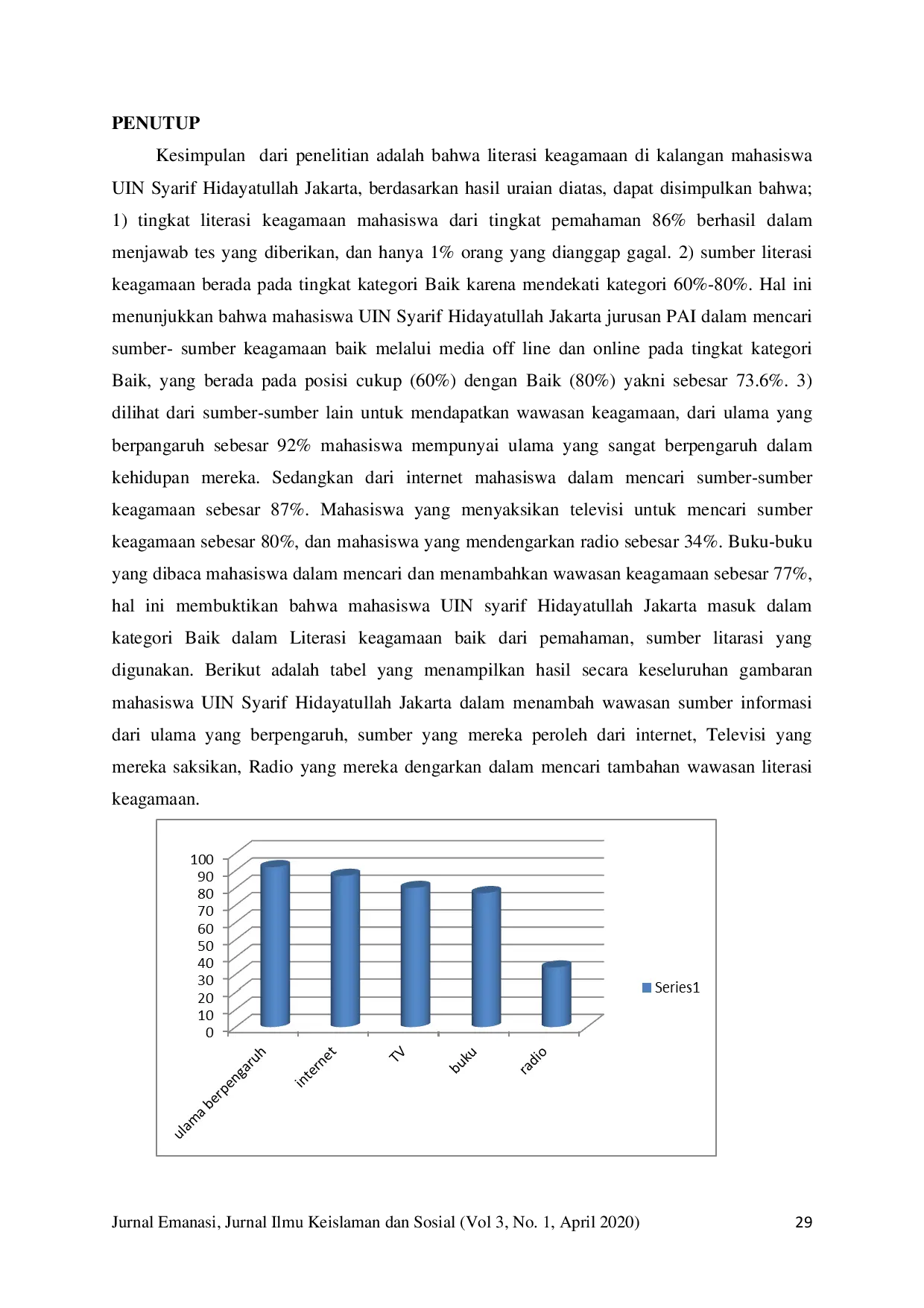 Tingkat literasi keagamaan mahasiswa UIN Syarif Hidayatullah Jakarta terbukti tinggi, dengan 86% mahasiswa berhasil pada tes pemahaman keagamaan dan hanya 1% yang gagal.Sumber literasi keagamaan mahasiswa berada pada kategori Baik (73,6%), mencakup media offline dan online, serta didominasi oleh pengaruh ulama (92%), internet (87%), televisi (80%), dan buku (77%).Meskipun radio hanya digunakan oleh 34% mahasiswa, secara keseluruhan literasi keagamaan mereka dapat dikategorikan baik berdasarkan pemahaman dan diversitas sumber informasi.