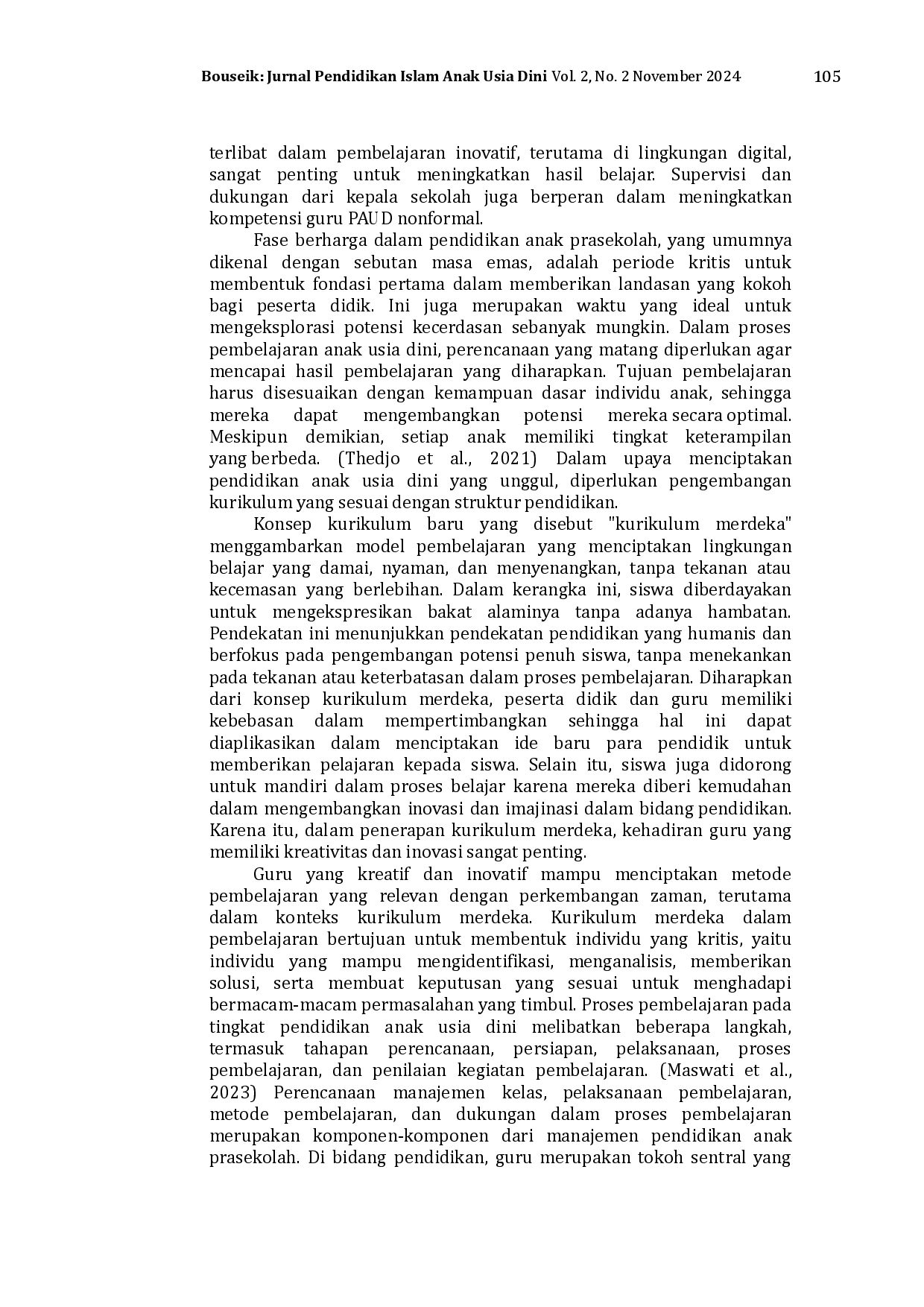 Bouseik: Jurnal Pendidikan Islam Anak Usia DiniBouseik: Jurnal Pendidikan Islam Anak Usia DiniInovasi dalam pendidikan melibatkan konsep seperti perubahan, pembaharuan, dan cara kerja baru untuk mencapai tujuan yang telah ditetapkan. Tujuan penelitian ini adalah peran guru dalam menciptakan inovasi pendidikan anak usia dini dapat berkontribusi dalam membangun masa depan yang berkualitas bagi generasi yang akan datang. Penelitian ini menggunakan pendekatan kualitatif dengan studi pustaka. Hasil penelitian menunjukkan bahwa peran guru dalam menerapkan inovasi pendidikan untuk meningkatkan kualitas pendidikan sangat ditekankan. Guru tidak hanya sebagai pengajar, tetapi juga sebagai fasilitator, penggerak transformasi, dan elemen kunci dalam menciptakan lingkungan pembelajaran yang inovatif dan berkualitas. Guru berkontribusi dalam menghadirkan inovasi dalam proses pembelajaran melalui pemilihan model pembelajaran yang sesuai, yang memengaruhi pencapaian hasil belajar siswa. Guru memiliki tanggung jawab dalam menghadirkan inovasi dalam pendidikan inklusif, mengurangi penggunaan layar pada anak usia dini, dan menggalakkan aktivitas fisik dalam pendidikan.