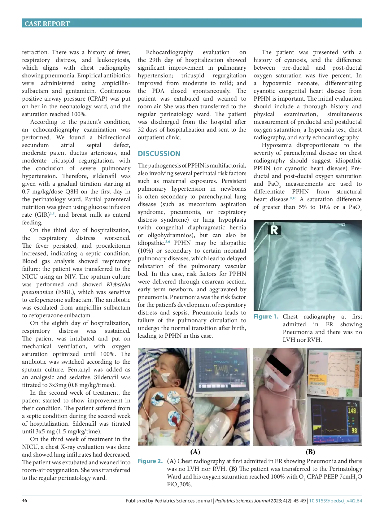 Pediatric Sciences JournalPediatric Sciences JournalPendahuluan: Hipertensi pulmonal persisten pada neonatus (PPHN) ditandai dengan peningkatan resistensi vaskular pulmonal yang disebabkan oleh kegagalan adaptasi sirkulasi dalam hitungan menit setelah persalinan, yang dapat menyebabkan distress napas berat dan hipoksemia. Studi ini bertujuan menyajikan penilaian dan pengobatan komprehensif pada neonatus dengan PPHN yang dapat diterapkan di berbagai fasilitas rumah sakit. Deskripsi kasus: Seorang bayi perempuan berusia satu hari datang ke unit gawat darurat dengan keluhan sianosis sejak lahir. Pemeriksaan menunjukkan perbedaan saturasi pre‑ductal dan post‑ductal sebesar 5%, napas lemah, dan radiografi dada menunjukkan pneumonia. Ekokardiogram mengungkap adanya defek septum atrium sekunder bidirectional, ductus arteriosus paten sedang, serta hipertensi pulmonal berat. Kultur sputum mengidentifikasi Klebsiella pneumoniae (ESBL). Manajemen komprehensif meliputi terapi antibiotik, CPAP, sildenafil, dan dukungan nutrisi. Setelah beberapa hari perawatan, pasien dipulangkan dalam kondisi baik. Kesimpulan: PPHN memiliki morbiditas dan mortalitas tinggi; evaluasi dan manajemen komprehensif serta pengendalian kondisi komorbid harus dilakukan untuk meningkatkan hasil klinis.
