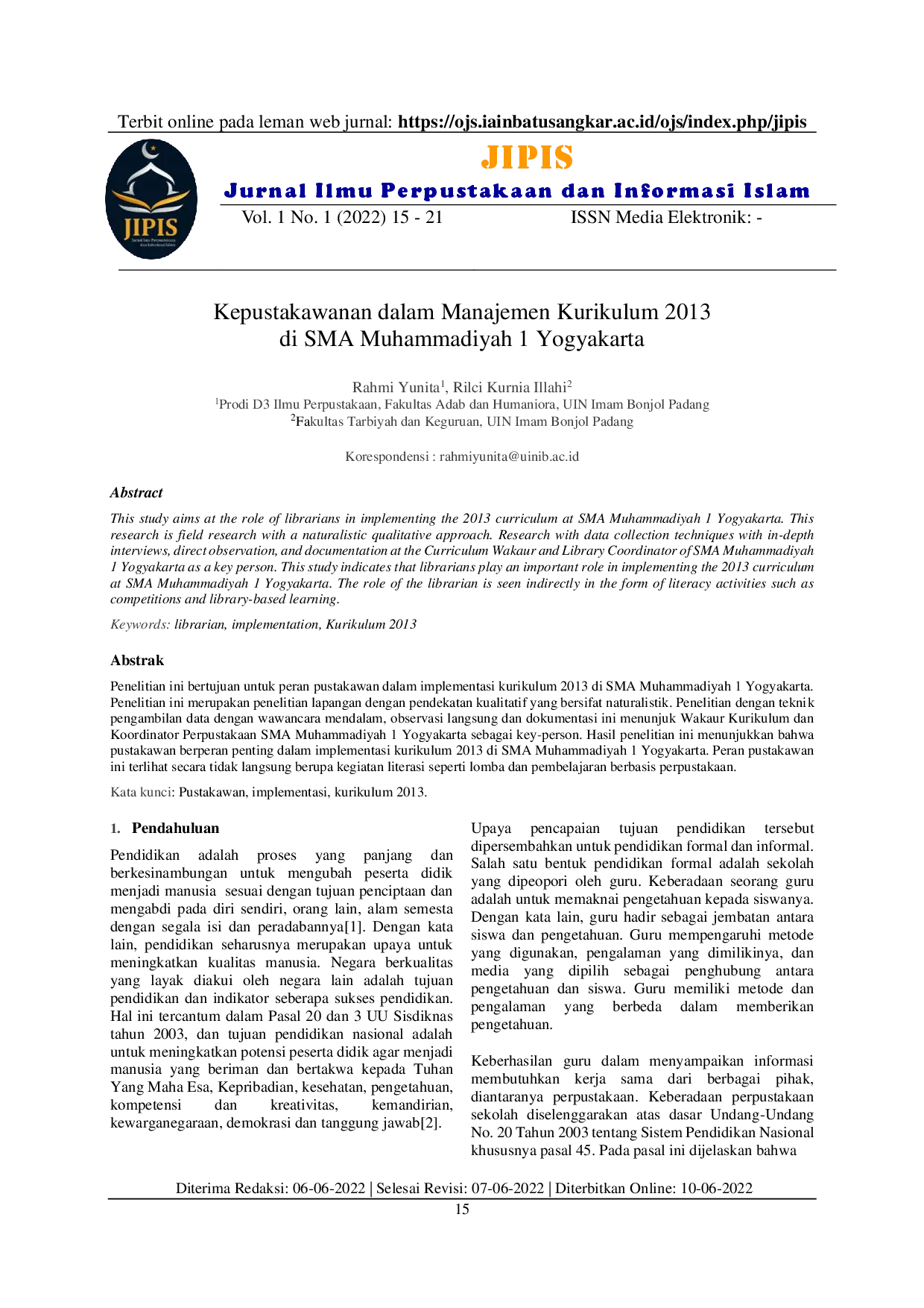 Jurnal Ilmu Perpustakaan dan Informasi IslamJurnal Ilmu Perpustakaan dan Informasi IslamPenelitian ini bertujuan untuk mengetahui peran pustakawan dalam implementasi kurikulum 2013 di SMA Muhammadiyah 1 Yogyakarta. Penelitian ini merupakan penelitian lapangan dengan pendekatan kualitatif naturalistik. Teknik pengumpulan data dilakukan melalui wawancara mendalam, observasi langsung, dan dokumentasi terhadap Wakil Kurikulum dan Koordinator Perpustakaan sebagai key person. Hasil penelitian menunjukkan bahwa pustakawan berperan penting dalam implementasi kurikulum 2013 melalui kegiatan literasi seperti lomba dan pembelajaran berbasis perpustakaan.