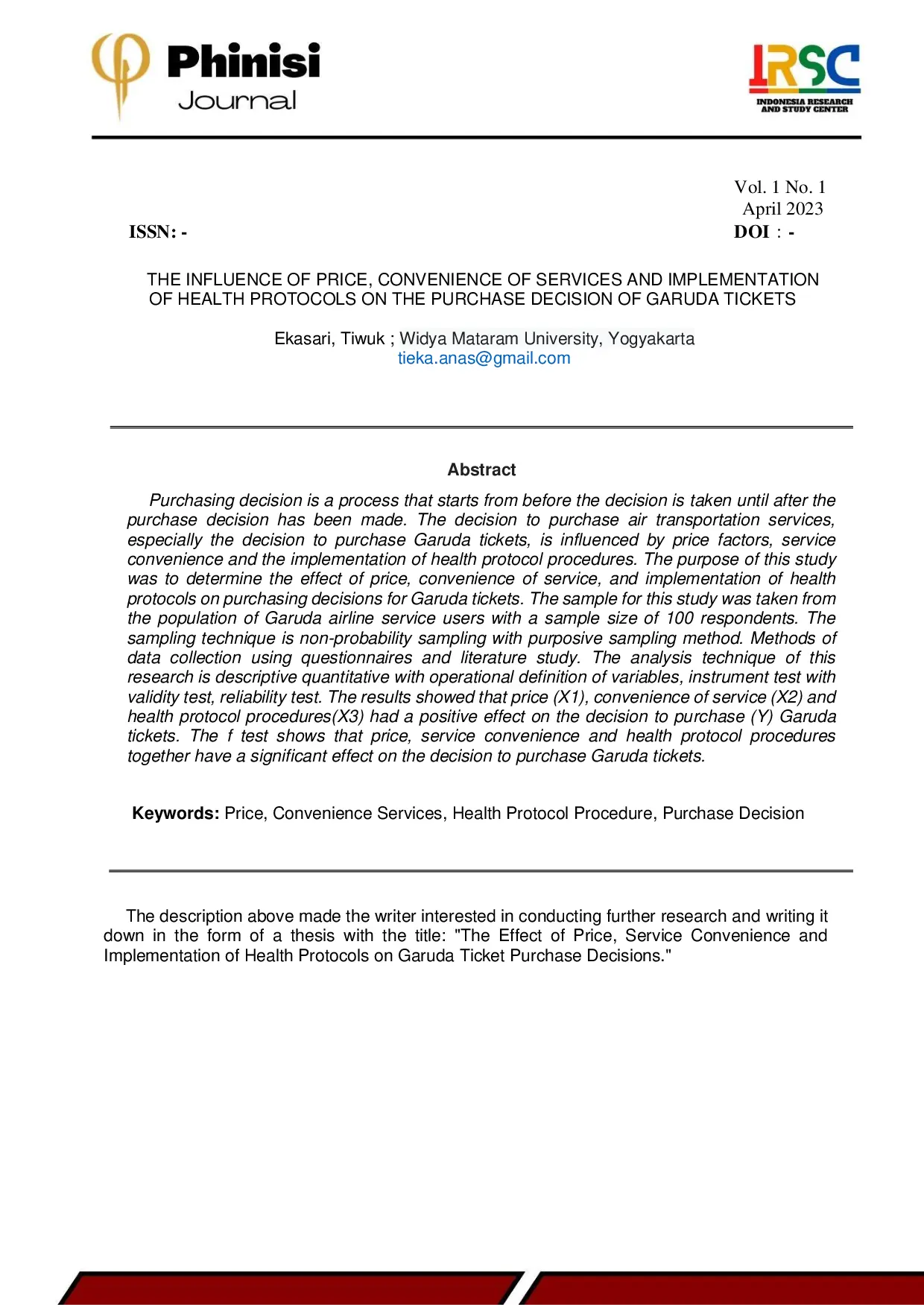 PHINISIPHINISIPurchasing decision adalah proses yang dimulai dari sebelum keputusan diambil hingga setelah keputusan pembelian telah dibuat. Keputusan untuk membeli jasa transportasi udara, terutama keputusan untuk membeli tiket Garuda, dipengaruhi oleh faktor harga, kenyamanan layanan, dan pelaksanaan prosedur protokol kesehatan.