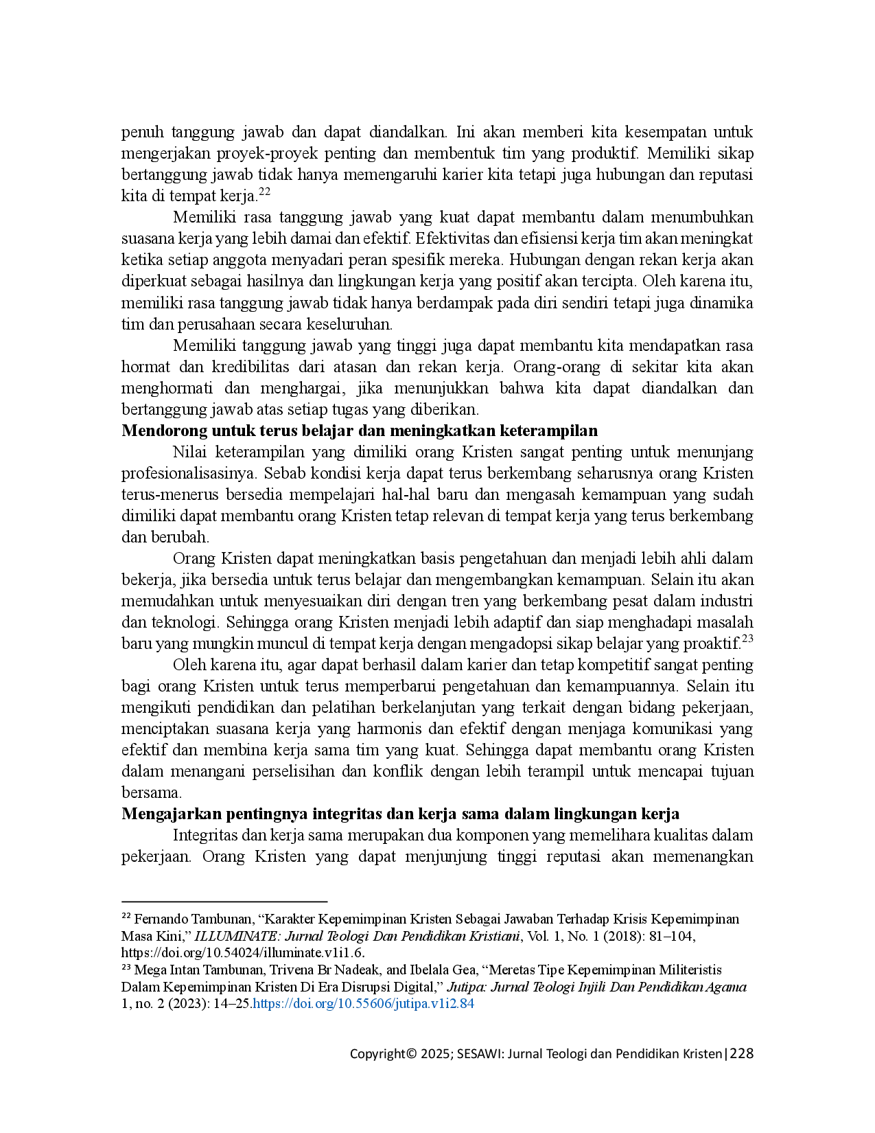 SESAWI: Jurnal Teologi dan Pendidikan KristenSESAWI: Jurnal Teologi dan Pendidikan KristenEtos kerja merupakan nilai moral yang sangat penting dalam kehidupan manusia, terutama dalam menghadapi tuntutan dunia kerja yang semakin kompleks. Kitab Amsal dalam Perjanjian Lama memberikan nasihat-nasihat bijak mengenai kerja keras, kedisiplinan, dan tanggung jawab. Penelitian ini bertujuan untuk mengkaji prinsip etos kerja menurut Amsal 6:6 dan 10:4 serta mengeksplorasi implementasinya dalam kehidupan orang Kristen masa kini. Metode yang digunakan adalah pendekatan kualitatif dengan studi pustaka dan analisis teks Alkitab. Hasil penelitian menunjukkan bahwa Amsal 6:6 menekankan ketekunan dan inisiatif melalui teladan semut, sementara Amsal 10:4 menyoroti perbedaan antara kemalasan dan kerajinan sebagai penentu keberhasilan. Implementasi prinsip ini relevan untuk membentuk karakter kerja orang Kristen agar bertanggung jawab, rajin, dan berintegritas dalam berbagai bidang kehidupan. Prinsip-prinsip ini penting untuk diterapkan sebagai wujud kesaksian iman di tengah masyarakat.