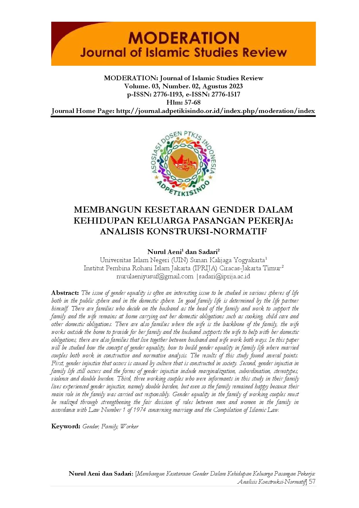 Moderation | Journal of Islamic Studies ReviewModeration | Journal of Islamic Studies ReviewIsu kesetaraan gender sering menjadi topik menarik untuk dipelajari dalam berbagai bidang kehidupan, baik di ranah publik maupun domestik. Kehidupan keluarga yang baik ditentukan oleh pasangan itu sendiri. Terdapat keluarga yang menetapkan suami sebagai kepala keluarga yang bekerja untuk mendukung keluarga, sementara istri tetap di rumah melaksanakan kewajiban domestik. Namun, ketidakadilan gender masih terjadi dalam bentuk marginalisasi, subordinasi, stereotip, kekerasan, dan beban ganda. Penelitian ini menemukan bahwa ketidakadilan gender dalam keluarga pasangan pekerja terjadi karena konstruksi budaya dan pembagian peran yang tidak seimbang. Meski begitu, keluarga tetap harmonis jika peran utama masing-masing anggota keluarga dilaksanakan secara tanggung jawab sesuai dengan Undang-Undang Perkawinan dan Kompilasi Hukum Islam.