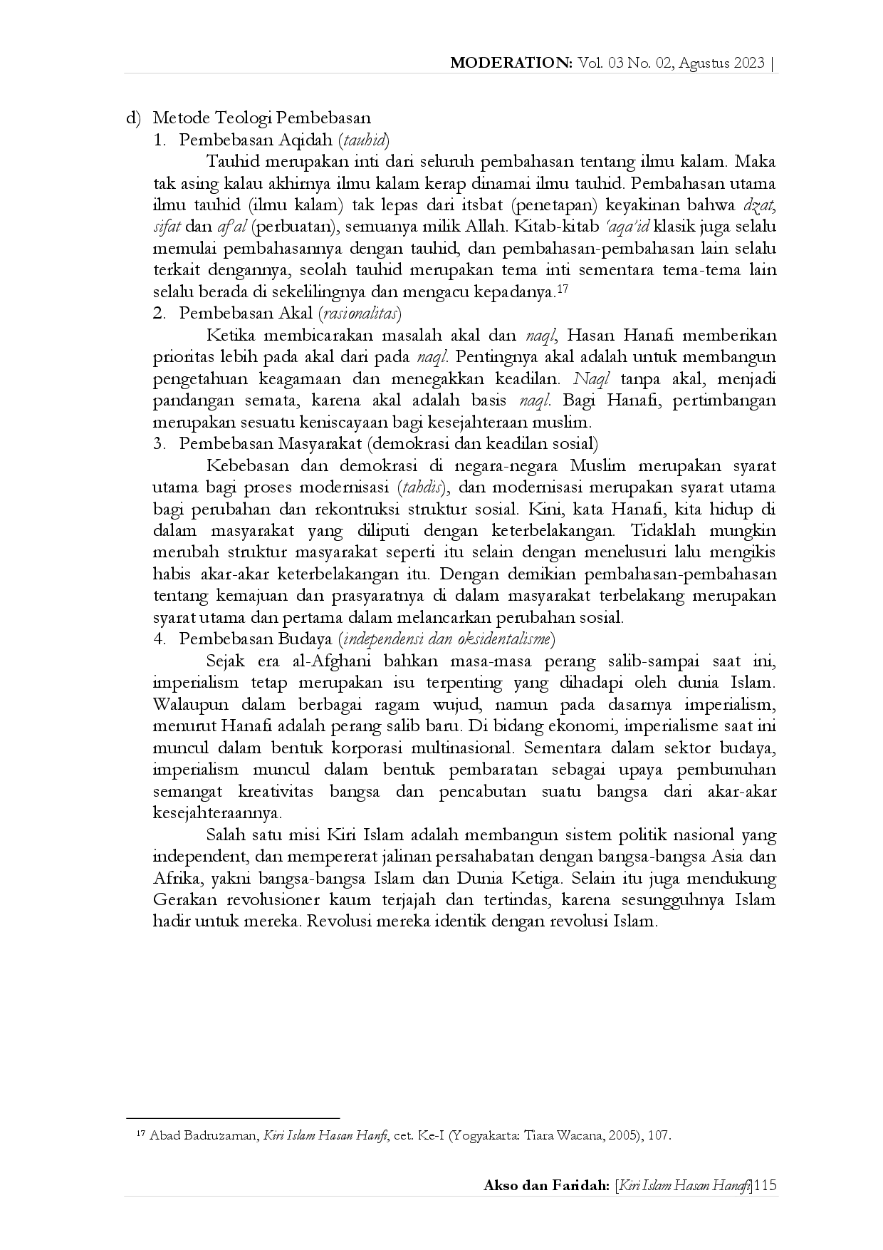 Moderation | Journal of Islamic Studies ReviewModeration | Journal of Islamic Studies ReviewIslam adalah praksis yang berusaha untuk menghancurkan tatanan sosial yang represif dan diskriminatif. Dalam konteks ini, teologi Islam selalu identik dengan teologi pembebasan. Hasan Hanafi menggunakan Islam kiri dalam konteks struktur sosial di mana ada dua kelas sosial yang berlawanan.