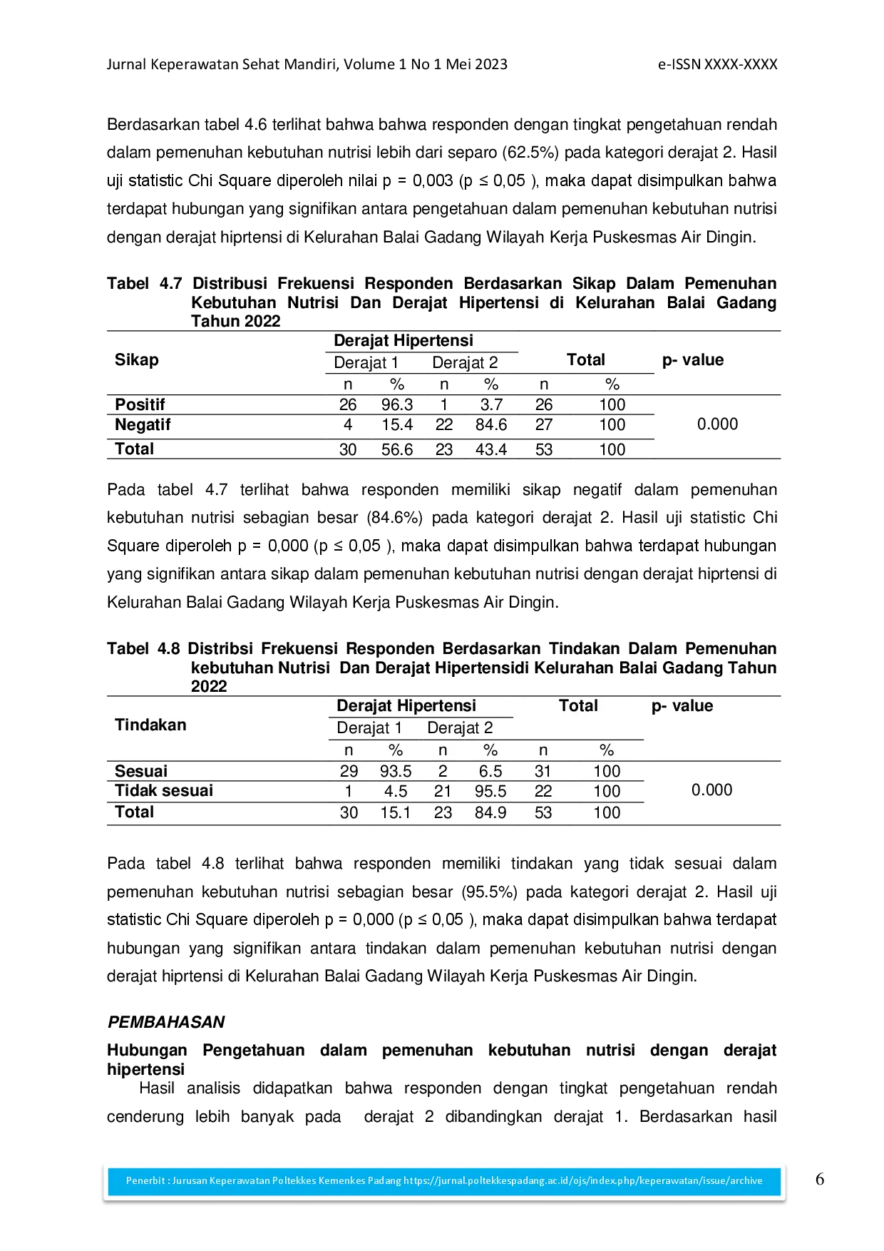 Jurnal Keperawatan Sehat MandiriJurnal Keperawatan Sehat MandiriHipertensi adalah penyakit keadaan kesehatan dengan peningkatan tekanan darah. Akibatnya, berisiko mengalami penyakit lain seperti stroke, penyakit jantung bahkan kematian. Salah satu faktor risiko yang bisa dirubah adalah perilaku. Perilaku yang dapat meningkatkan tekanan darah seperti mengkonsumsi makanan tinggi kadar garam dan lemak. Penelitian bertujuan mengetahui hubungan perilaku dalam pemenuhan kebutuhan nutrisi dengan derajat hipertensi pada pasien hipertensi. Jenis penelitian ini adalah survey analitik dengan desain cross sectional study. Penelitian ini dilakukan di Kelurahan Balai Gadang Wilayah Kerja Puskesmas Air Dingin dimulai dari tanggal Januari – Juni 2022. Populasi penelitian semua pasien hipertensi yang berada di Kelurahan Balai Gadang. Sampel penelitian menggunakan teknik accidental sampling dengan rumus lameshow sebanyak 53 orang. Pengumpulan data menggunakan angket, pengolahan dengan tahapan editing, coding, entry, cleaning.. Analisa dilakukan menggunakan distribusi frequensi uji Chi Square (CI 95%). Hasil penelitian didapatkan derajat hipertensi 1 (56.6%), tingkat pengetahuan tinggi (54.7%), sikap negatif (50.9%), tindakan (58.5%) sehingga terdapat hubungan antara perilaku dalam pemenuhan kebutuhn nutrisi dengan derajat hipertensi, yaitu pengetahuan (p value = 0.006), sikap (p value = 0.000), dan tindakan (p value = 0.000). Disarankan kepada perawat agar ditingkatkan upaya edukasi KIE tentang makanan yang dianjurkan dalam pemenuhan kebutuhan nutrisi untuk meningkatkan pengetahuan pasien hipertensi di Kelurahan Balai Gadang.