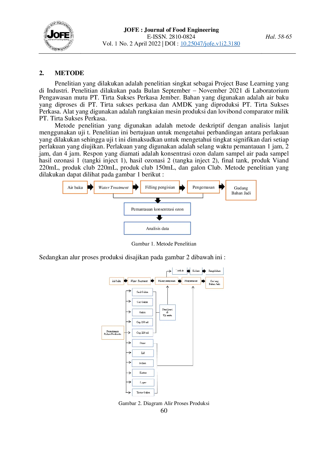 Journal of Food EngineeringJournal of Food EngineeringPenggunaan air yang paling utama yaitu sebagai air minum. PT. Tirta Sukses Perkasa merupakan salah satu perusahaan yang memproduksi Air Minum Dalam Kemasan (AMDK) dengan merek dagang Club dan Viand. Titik kendali kritis pada produksi AMDK adalah disinfeksi dengan teknologi ozon. Pemantauan ozon di PT. Tirta Sukses Perkasa dilakukan selama 2 jam sekali. Dalam rangka meningkatkan efektivitas produksi, dilakukan penelitian untuk mengetahui pengaruh selang waktu pemantauan ozon pada proses produksi AMDK. Evaluasi dilakukan pada selang waktu pemantauan 1 jam dan 4 jam. Selang waktu 1 jam dan 4 jam ini dilakukan untuk mengetahui waktu efisien selama 1 kali shift. 1 shiftnya adalah 8 jam kerja, sehingga pada waktu 1 jam pemantauan konsentrasi ozon dilakukan selama 8 kali/shift. Selang waktu 1 jam dan 4 jam ini dilakukan untuk mengetahui waktu efisien selama 1 kali shift. Metode pengolahan data yang dilakukan yaitu menggunakan uji t. Berdasarkan hasil evaluasi pengujian yang dilakukan menunjukkan bahwa ozon pada selang waktu 1, 2, dan 4 jam tidak berbeda nyata.