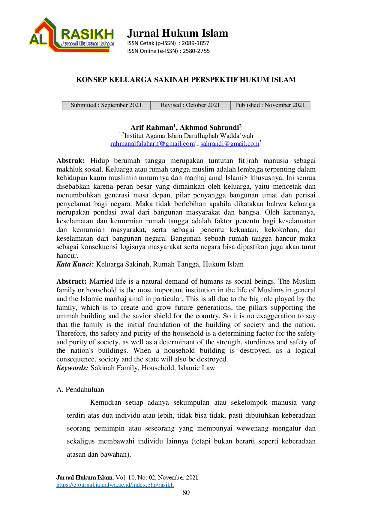al-Rasῑkh: Jurnal Hukum Islamal-Rasῑkh: Jurnal Hukum IslamHidup berumah tangga merupakan tuntutan fit}rah manusia sebagai makhluk sosial. Keluarga atau rumah tangga muslim adalah lembaga terpenting dalam kehidupan kaum muslimin umumnya dan manhaj amal Islami> khususnya. Ini semua disebabkan karena peran besar yang dimainkan oleh keluarga, yaitu mencetak dan menumbuhkan generasi masa depan, pilar penyangga bangunan umat dan perisai penyelamat bagi negara. Maka tidak berlebihan apabila dikatakan bahwa keluarga merupakan pondasi awal dari bangunan masyarakat dan bangsa. Oleh karenanya, keselamatan dan kemurnian rumah tangga adalah faktor penentu bagi keselamatan dan kemurnian masyarakat, serta sebagai penentu kekuatan, kekokohan, dan keselamatan dari bangunan negara. Bangunan sebuah rumah tangga hancur maka sebagai konsekuensi logisnya masyarakat serta negara bisa dipastikan juga akan turut hancur.