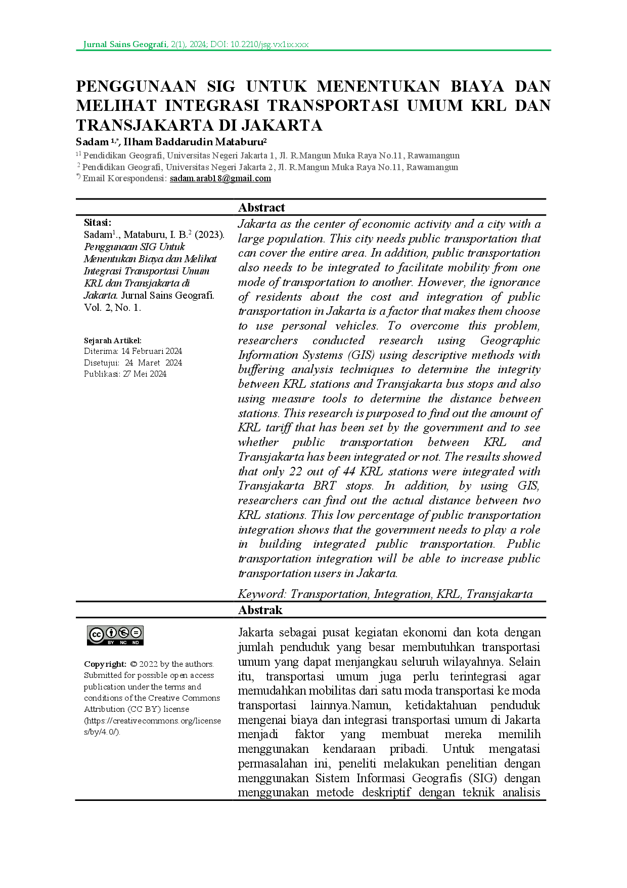 Jurnal Sains GeografiJurnal Sains GeografiJakarta sebagai pusat kegiatan ekonomi dan kota dengan jumlah penduduk yang besar membutuhkan transportasi umum yang dapat menjangkau seluruh wilayahnya. Selain itu, transportasi umum perlu terintegrasi agar memudahkan mobilitas dari satu moda transportasi ke moda transportasi lainnya. Namun, ketidaktahuan penduduk mengenai biaya dan integrasi transportasi umum di Jakarta menjadi faktor yang membuat mereka memilih menggunakan kendaraan pribadi. Untuk mengatasi permasalahan ini, peneliti melakukan penelitian dengan menggunakan Sistem Informasi Geografis (SIG) dengan menggunakan metode deskriptif dengan teknik analisis buffering untuk menentukan integritas antara stasiun KRL dengan halte Transjakarta dan juga menggunakan tools measure untuk menentukan jarak antar stasiun. Penelitian ini bertujuan untuk mengetahui besaran tarif KRL yang telah ditetapkan oleh pemerintah dan untuk melihat apakah transportasi umum antara KRL dan Transjakarta sudah terintegrasi atau belum. Hasil penelitian menunjukkan bahwa hanya 22 dari 44 stasiun KRL yang terintegrasi dengan halte BRT Transjakarta. Selain itu, dengan menggunakan SIG, peneliti dapat mengetahui jarak sebenarnya antara dua stasiun KRL. Presentase integrasi transportasi umum yang rendah ini menunjukkan bahwa perlu peran pemerintah untuk membangun transportasi umum yang terintegrasi. Integrasi transportasi umum akan dapat meningkatkan pengguna transportasi umum di Jakarta.