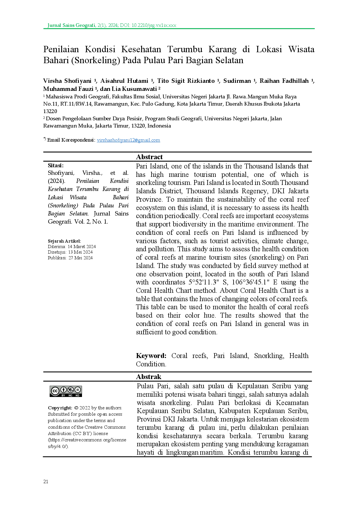 Jurnal Sains GeografiJurnal Sains GeografiPulau Pari, salah satu pulau di Kepulauan Seribu yang memiliki potensi wisata bahari tinggi, salah satunya adalah wisata snorkeling. Pulau Pari berlokasi di Kecamatan Kepulauan Seribu Selatan, Kabupaten Kepulauan Seribu, Provinsi DKI Jakarta. Untuk menjaga kelestarian ekosistem terumbu karang di pulau ini, perlu dilakukan penilaian kondisi kesehatannya secara berkala. Terumbu karang merupakan ekosistem penting yang mendukung keragaman hayati di lingkungan maritim. Kondisi terumbu karang di Pulau Pari dipengaruhi oleh berbagai faktor, seperti aktivitas wisata, perubahan iklim, dan pencemaran. Penelitian ini bertujuan untuk menilai kondisi kesehatan terumbu karang pada lokasi wisata bahari (snorkeling) di Pulau Pari. Penelitian dilakukan dengan metode survei lapangan pada satu titik pengamatan yaitu berlokasi di selatan Pulau Pari dengan titik koordinat 5°5211.3 S, 106°3645.1 E menggunakan metode Coral Health Chart. Mengenai Coral Health Chart adalah tabel yang berisi rona perubahan warna terumbu karang. Tabel ini dapat digunakan untuk memantau kesehatan terumbu karang berdasarkan rona warnanya. Hasil penelitian menunjukkan bahwa kondisi terumbu karang di Pulau Pari secara umum berada dalam kondisi cukup hingga baik.