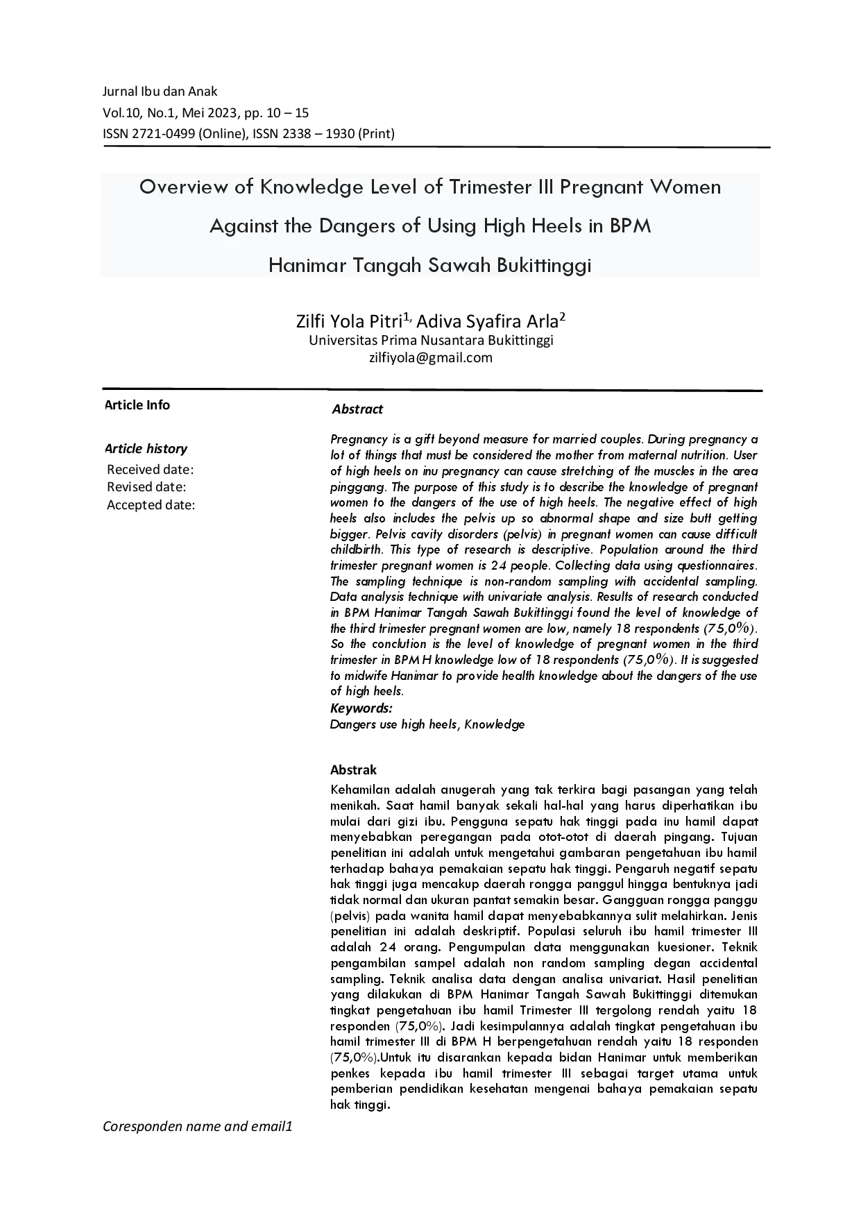 JURNAL IBU DAN ANAKJURNAL IBU DAN ANAKKehamilan adalah anugerah yang tak terkira bagi pasangan yang telah menikah. Saat hamil banyak sekali hal-hal yang harus diperhatikan ibu mulai dari gizi ibu. Pengguna sepatu hak tinggi pada ibu hamil dapat menyebabkan peregangan pada otot-otot di daerah pinggang. Tujuan penelitian ini adalah untuk mengetahui gambaran pengetahuan ibu hamil terhadap bahaya pemakaian sepatu hak tinggi. Pengaruh negatif sepatu hak tinggi juga mencakup daerah rongga panggul hingga bentuknya jadi tidak normal dan ukuran pantat semakin besar. Gangguan rongga panggul (pelvis) pada wanita hamil dapat menyebabkannya sulit melahirkan. Jenis penelitian ini adalah deskriptif. Populasi seluruh ibu hamil trimester III adalah 24 orang. Pengumpulan data menggunakan kuesioner. Teknik pengambilan sampel adalah non‑random sampling dengan accidental sampling. Teknik analisa data dengan analisa univariat. Hasil penelitian yang dilakukan di BPM Hanimar Tangah Sawah Bukittinggi ditemukan tingkat pengetahuan ibu hamil Trimester III tergolong rendah yaitu 18 responden (75,0%). Jadi kesimpulannya adalah tingkat pengetahuan ibu hamil trimester III di BPM H berpengetahuan rendah yaitu 18 responden (75,0%). Untuk itu disarankan kepada bidan Hanimar untuk memberikan pendidikan kesehatan kepada ibu hamil trimester III sebagai target utama untuk pemberian pendidikan kesehatan mengenai bahaya pemakaian sepatu hak tinggi.