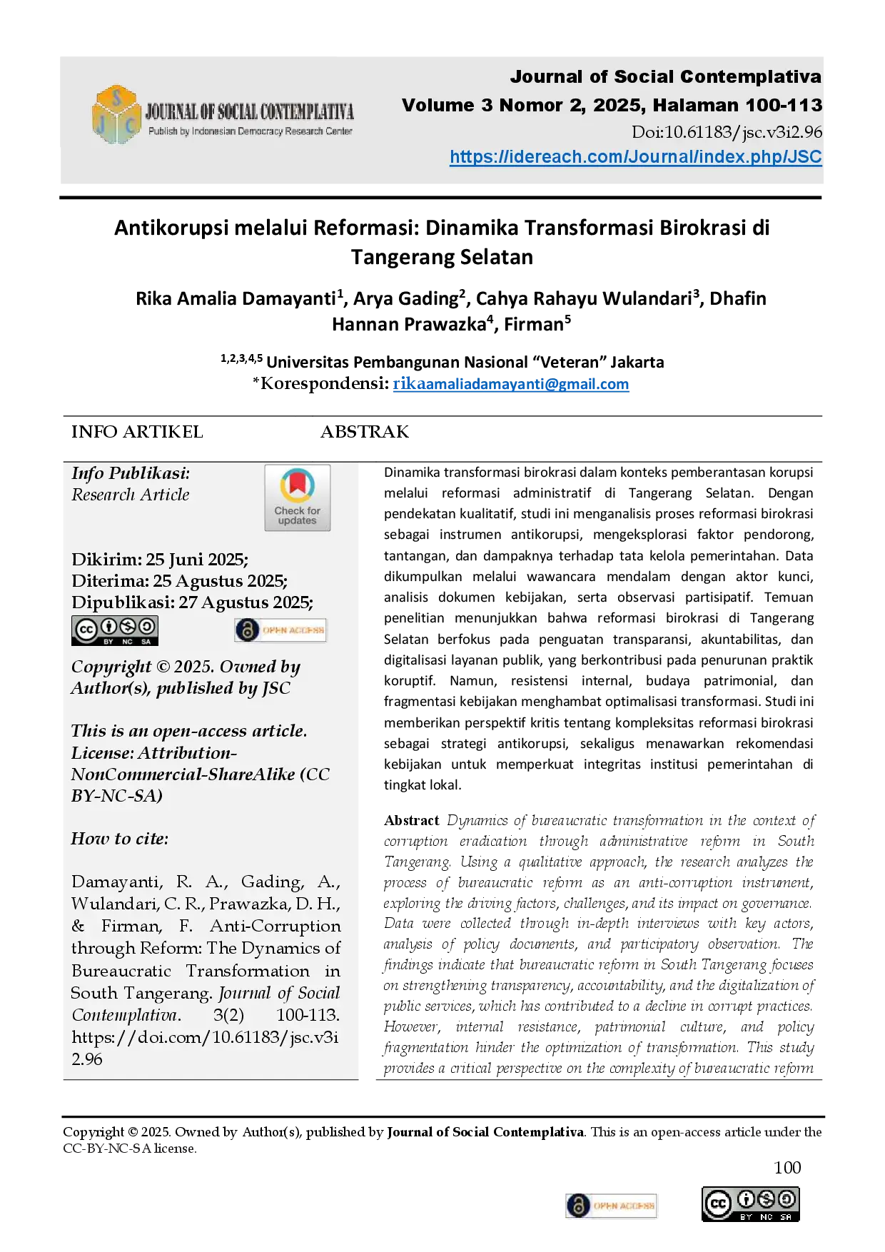 Journal of Social ContemplativaJournal of Social ContemplativaDinamika transformasi birokrasi dalam konteks pemberantasan korupsi melalui reformasi administratif di Tangerang Selatan. Dengan pendekatan kualitatif, studi ini menganalisis proses reformasi birokrasi sebagai instrumen antikorupsi, mengeksplorasi faktor pendorong, tantangan, dan dampaknya terhadap tata kelola pemerintahan. Data dikumpulkan melalui wawancara mendalam dengan aktor kunci, analisis dokumen kebijakan, serta observasi partisipatif. Temuan penelitian menunjukkan bahwa reformasi birokrasi di Tangerang Selatan berfokus pada penguatan transparansi, akuntabilitas, dan digitalisasi layanan publik, yang berkontribusi pada penurunan praktik koruptif. Namun, resistensi internal, budaya patrimonial, dan fragmentasi kebijakan menghambat optimalisasi transformasi. Studi ini memberikan perspektif kritis tentang kompleksitas reformasi birokrasi sebagai strategi antikorupsi, sekaligus menawarkan rekomendasi kebijakan untuk memperkuat integritas institusi pemerintahan di tingkat lokal.
