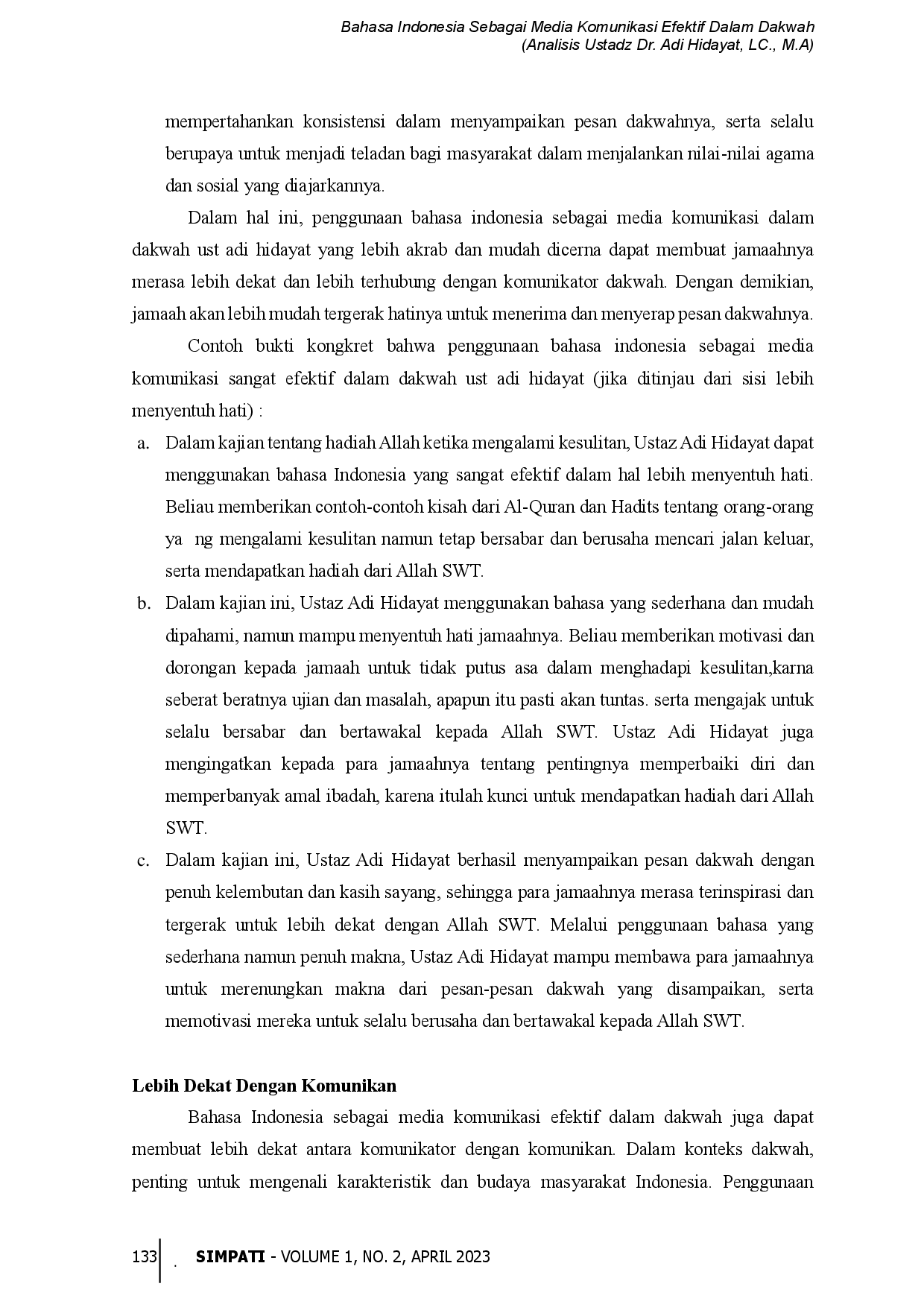 SimpatiSimpatiArtikel ini bertujuan untuk memahami peran penting bahasa indonesia dalam dakwah atau penyebaran agama islam dengan memahami dan menguasai bahasa indonesia dengan baik. Dalam konteks keberagaman Indonesia, penggunaan Bahasa Indonesia dalam dakwah perlu memperhatikan pesan-pesan yang inklusif dan toleran. Bahasa merupakan hal yang tidak bisa dipisahkan dari kehidupan manusia. Para pendakwah dapat mengkomunikasikan pesan pesan keagamaan dengan lebih efektif kepada khalayak umum dan untuk menghidari penggunaan bahasa indonesia yang kurang tepat dalam berdakwah. Metode penelitian yang digunakan yaitu metode deskriptif kualitatif. Pengumpulan data dilakukan dengan teknik pengumpulan data melalui teknik dokumentasi, teknik simak, dan teknik catat terhadap dakwah video dakwah yang disampaikan oleh Ustadz Dr. Adi Hidayat, Lc., M.A dalam Channel youtube Adi Hidayat Official. Berdasarkan hasil penelitian ditemukan adanya ketegasan dalam menyampaikan pesan serta adanya interaksi dalam hal ini pula ditemukan bahwa bahasa indonesia dalam dakwah lebih dipahami, menyentuh hati, lebih dekat antara pendakwah dengan audience sehingga terbentuk ketertarikan audience terhadap pendakwah dalam mendegarkan dakwah tersebut.