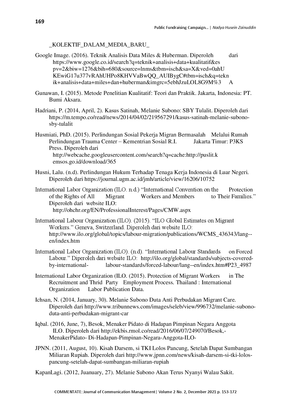 COMMENTATE: Journal of Communication ManagementCOMMENTATE: Journal of Communication ManagementFundraising is a common practice, particularly for social campaigns that evoke public sympathy. Migrant Cares fundraising initiative for Satinah, an Indonesian migrant worker sentenced to death for the unintentional killing of her employer in Saudi Arabia, was notably successful, collecting Rp 2.8 billion in two weeks. Driven by disappointment in the Indonesian governments perceived lack of support for Satinahs diyat (blood money), Migrant Care launched a crowdfunding campaign. This research employs a qualitative descriptive approach, utilizing interviews and documentation analyzed through Carl Hovlands SMCR theory (source, message, channel, and receiver).