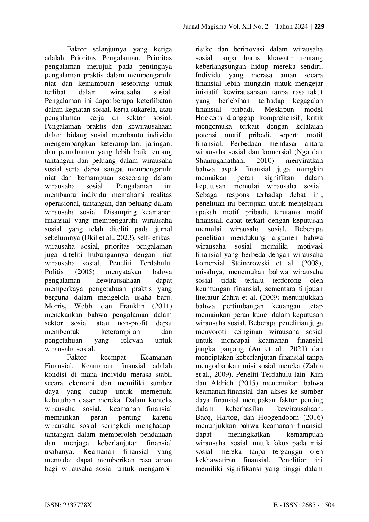 Magisma: Jurnal Ilmiah Ekonomi dan BisnisMagisma: Jurnal Ilmiah Ekonomi dan BisnisTujuan penelitian untuk mengkaji hubungan atau pengaruh self efficacy, wirausaha sosial, prioritas pengalaman, dan keamanan finansial terhadap niat wirausaha sosial. Sampel penelitian terdiri dari mahasiswa MM STIE BPD Jateng sebanyak 100 orang. Data dianalisis menggunakan model persamaan struktural untuk menguji hubungan antara variabel-variabel tersebut, menggunakan PLS versi4. Hasil penelitian menunjukkan bahwa niat wirausaha sosial dipengaruhi secara signifikan oleh self-efikasi wirausaha sosial dan prioritas pengalamany dengan p value < 0,5. Selain itu, keamanan finansial juga berperan penting dalam mendukung niat wirausaha sosial. Individu dengan tingkat self-efikasi yang tinggi dan pengalaman praktis yang prioritas cenderung memiliki niat yang kuat untuk terjun ke wirausaha sosial. Keamanan finansial memberikan dukungan tambahan dengan mengurangi risiko dan ketidakpastian yang dihadapi oleh calon wirausaha sosial. Penelitian ini memberikan implikasi penting bagi pengembangan program pelatihan dan kebijakan yang mendukung niat wirausaha sosial. Meningkatkan self-efikasi dan memberikan kesempatan pengalaman praktis dapat mendorong lebih banyak individu untuk terlibat dalam niat wirausaha sosial. Selain itu, menciptakan lingkungan yang mendukung keamanan finansial akan memperkuat keberhasilan niat wirausaha sosial. Saran penelitian lanjutan dengan teoritis yang kuat untuk mengeksplorasi, dan untuk meneliti dinamika niat wirausaha sosial dan faktor-faktor lainnya yang mempengaruhinya.