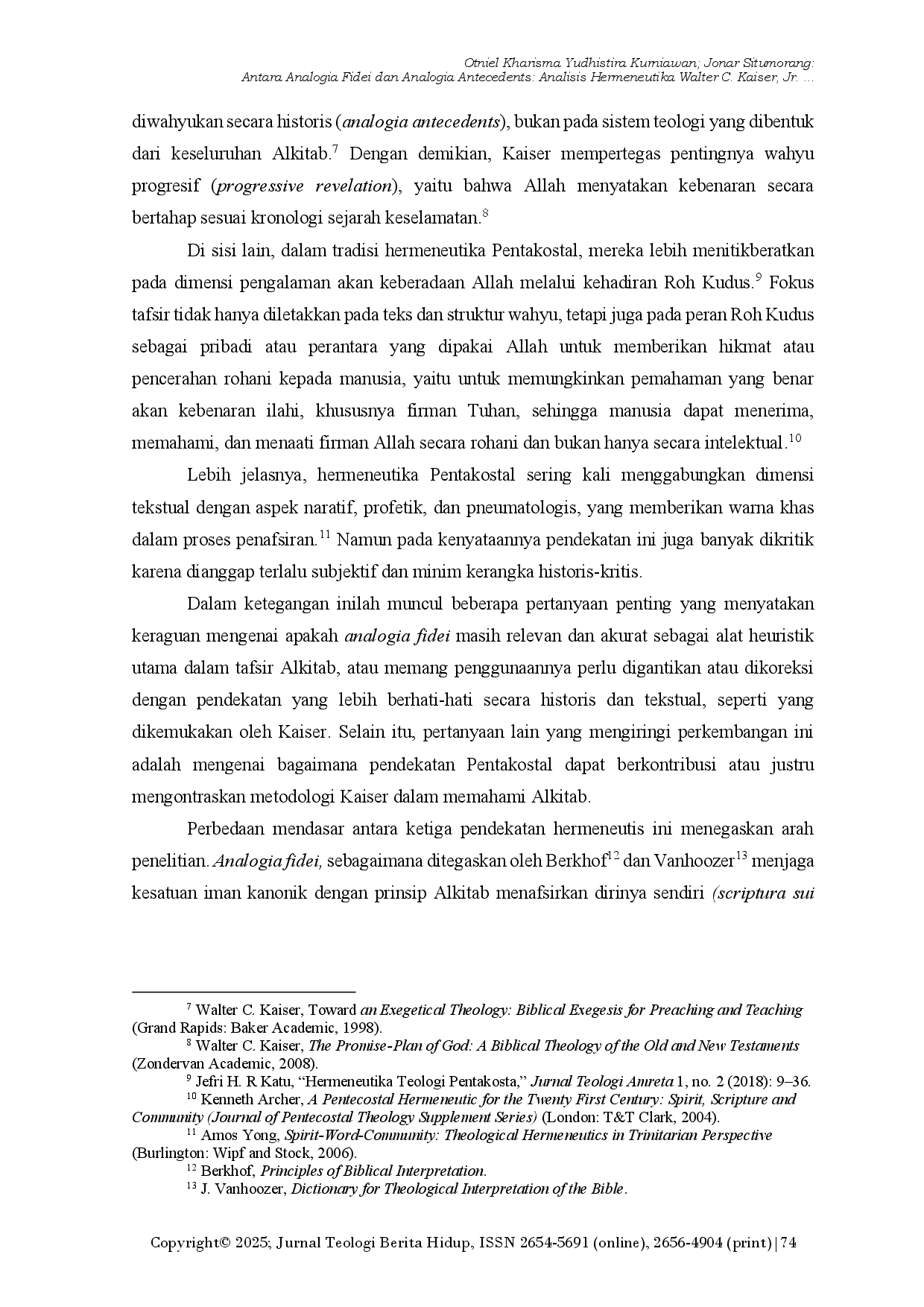 Jurnal Teologi Berita HidupJurnal Teologi Berita HidupArtikel ini ditulis untuk mengkaji pendekatan hermeneutika Walter C. Kaiser, Jr., dalam kritiknya terhadap penggunaan analogi iman (analogia fidei) sebagai alat tafsir utama dalam teologi biblika. Kaiser memberi usulan analogia antecedents sebagai alternatif untuk menafsirkan Alkitab berdasarkan teks-teks yang telah diwahyukan sebelumnya secara kronologis. Tujuannya untuk menjaga maksud historis dan maksud sebenarnya (autoritatif) dari penulis aslinya. Penelitian dalam artikel ini menggunakan metode kualitatif melalui studi pustaka dengan pendekatan analisis komparatif terhadap karya-karya utama Kaiser dan literatur hermeneutika dari tradisi Pentakostal. Melalui analisis komparatif, didapatkan hasil bahwa keduanya tetap berpegang pada otoritas Alkitab, namun keduanya menawarkan metodologi heuristik yang berbeda dalam menafsirkan teks, dimana yang satu menekankan struktur wahyu progresif, sementara yang lain memberi tempat pada pengalaman pneumatologis. Kesimpulan yang didapat adalah bahwa kedua pendekatan ini memiliki kekuatan dan keterbatasan masing-masing, namun keduanya membuka peluang integrasi yang kaya antara kesetiaan pada teks dan kepekaan terhadap peran Roh Kudus dalam penafsiran Alkitab.
