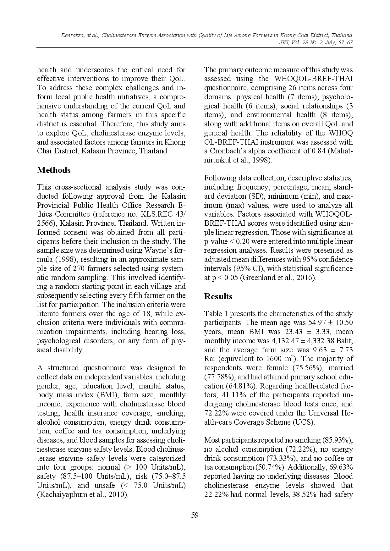 Jurnal Keperawatan IndonesiaJurnal Keperawatan IndonesiaEnzim Kolinesterase Berhubungan dengan Kualitas Hidup Petani di Distrik Khong Chai, Provinsi Kalasin, Thailand. Sektor pertanian di Thailand menghadapi tantangan yang mempengaruhi kesehatan dan kualitas hidup petani. Penelitian ini mengeksplorasi kualitas hidup, kadar enzim kolinesterase, dan faktor-faktor yang berhubungan dengan kualitas hidup petani di Distrik Khong Chai, Provinsi Kalasin, Thailand. Kami melakukan studi analisis cross-sectional terhadap petani yang dipilih menggunakan teknik systematic random sampling. Responden memiliki usia rata-rata 54,97 ± 10,50 tahun dengan rentang usia antara 25 hingga 75 tahun. Sebanyak 75,56% responden adalah perempuan (n = 204), 24,44% adalah laki-laki (n = 66). Keuesioner terstruktur mengumpulkan data demografi, sampel darah untuk tingkat keamanan enzim kolinesterase, dan respon terhadap kuesioner World Health Organization Quality of Life Brief-Thai (WHOQOL-BREF-THAI). Data dianalisis menggunakan statistik deskriptif dan inferensial. Regresi linear berganda digunakan untuk mengidentifikasi faktor-faktor yang terkait dengan skor WHOQOL-BREF-THAI, menyajikan adjusted mean differences, 95% confidence intervals (95% CI), dan nilai p. Penelitian mengungkapkan bahwa rerata skor WHOQOL-BREF-THAI adalah 89,97 ± 10,34. Faktor-faktor yang berhubungan dengan skor ini antara lain jenis kelamin (laki-laki: 3,06; p = 0,032), luas lahan pertanian 10 Rai (1600 m2) ke atas (2,55; p = 0,039), frekuensi tes darah kolinesterase (1 kali: 3,01; tidak pernah: 3,40; p = 0,039; referensi: 2 kali atau lebih), dan tingkat keamanan enzim kolinesterase darah (tidak aman: 1,69; p = 0,037). Temuan ini menyoroti perlunya intervensi untuk mengurangi faktor-faktor risiko, khususnya di kalangan petani dengan tingkat enzim kolinesterase yang tidak aman, guna meningkatkan kualitas hidup pada populasi ini.