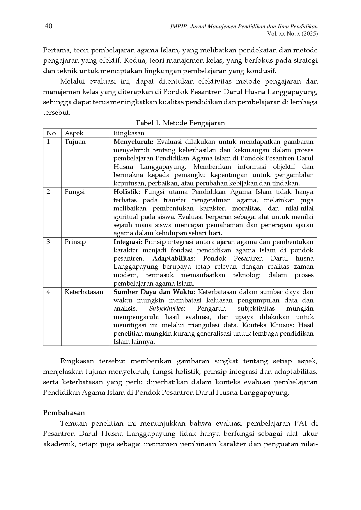 JMPIP (Jurnal Manajemen Pendidikan dan Ilmu Pendidikan)JMPIP (Jurnal Manajemen Pendidikan dan Ilmu Pendidikan)Evaluasi pembelajaran merupakan komponen esensial dalam proses pendidikan, khususnya di pesantren yang mengintegrasikan penguasaan ilmu agama, pengembangan akhlak, dan pembinaan keterampilan hidup Islami. Penelitian ini bertujuan untuk menguraikan tujuan, fungsi, dan prinsip evaluasi pembelajaran Pendidikan Agama Islam (PAI) di Pesantren Darul Husna Langgapayung.