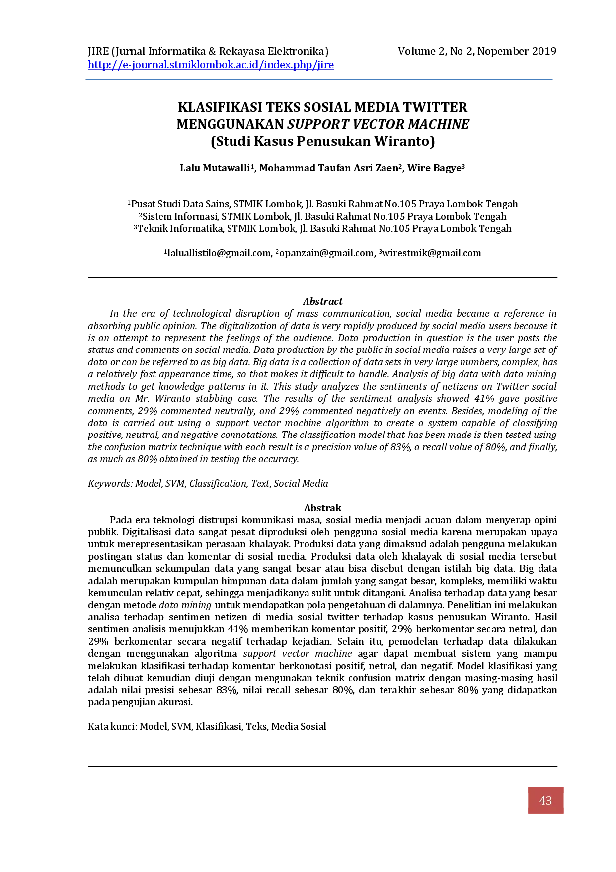 Jurnal Informatika dan Rekayasa ElektronikJurnal Informatika dan Rekayasa ElektronikPada era teknologi distrupsi komunikasi masa, sosial media menjadi acuan dalam menyerap opini publik. Digitalisasi data sangat pesat diproduksi oleh pengguna sosial media karena merupakan upaya untuk merepresentasikan perasaan khalayak. Produksi data yang dimaksud adalah pengguna melakukan postingan status dan komentar di sosial media. Produksi data oleh khalayak di sosial media tersebut memunculkan sekumpulan data yang sangat besar atau bisa disebut dengan istilah big data. Big data adalah merupakan kumpulan himpunan data dalam jumlah yang sangat besar, kompleks, memiliki waktu kemunculan relativ cepat, sehingga menjadikanya sulit untuk ditangani. Analisa terhadap data yang besar dengan metode data mining untuk mendapatkan pola pengetahuan di dalamnya. Penelitian ini melakukan analisa terhadap sentimen netizen di media sosial twitter terhadap kasus penusukan Wiranto. Hasil sentimen analisis menujukkan 41% memberikan komentar positif, 29% berkomentar secara netral, dan 29% berkomentar secara negatif terhadap kejadian. Selain itu, pemodelan terhadap data dilakukan dengan menggunakan algoritma support vector machine agar dapat membuat sistem yang mampu melakukan klasifikasi terhadap komentar berkonotasi positif, netral, dan negatif. Model klasifikasi yang telah dibuat kemudian diuji dengan mengunakan teknik confusion matrix dengan masing-masing hasil adalah nilai presisi sebesar 83%, nilai recall sebesar 80%, dan terakhir sebesar 80% yang didapatkan pada pengujian akurasi.