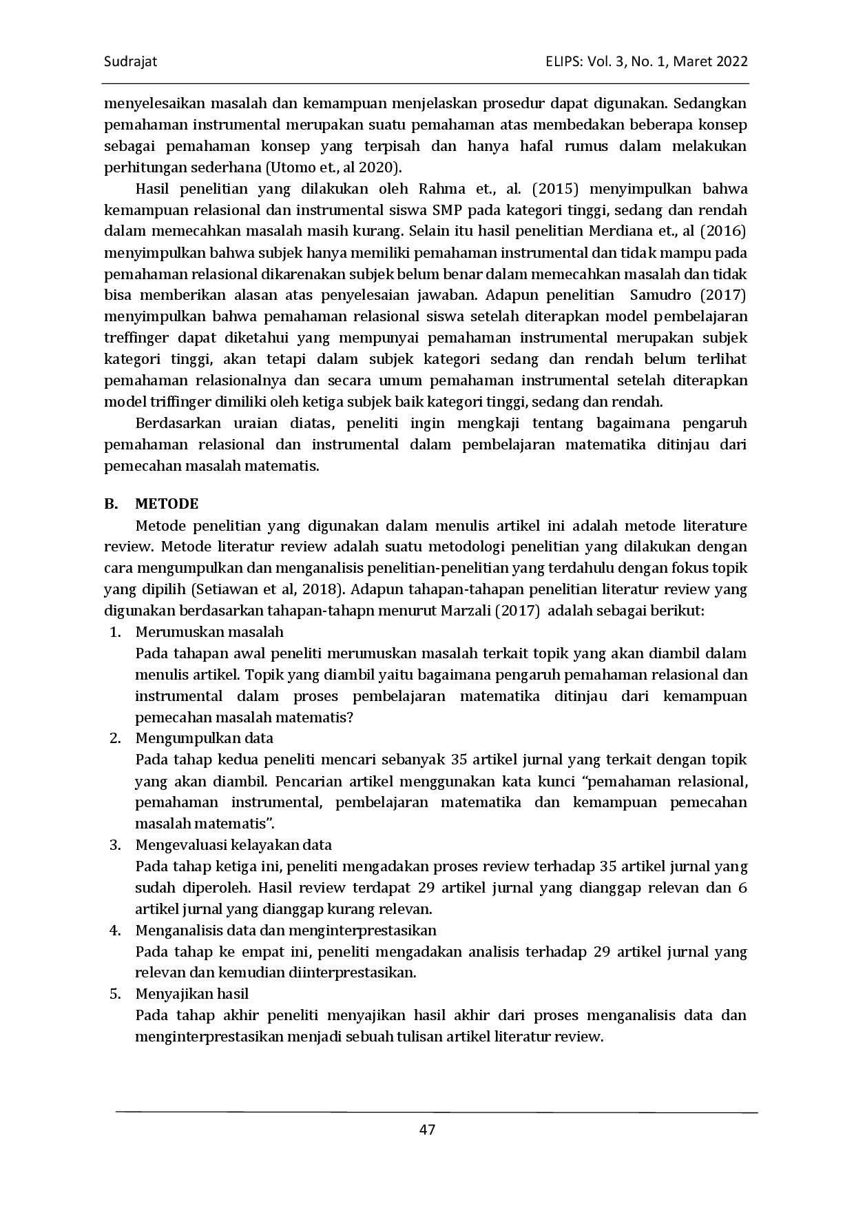 ELIPS: Jurnal Pendidikan MatematikaELIPS: Jurnal Pendidikan MatematikaTujuan penelitian ini untuk mengkaji bagaimana pengaruh pemahaman relasional dan instrumental dalam proses pembelajaran matematika ditinjau dari kemampuan pemecahan masalah matematis. Jenis penelitian ini menggunakan literature review. Adapun langkah-langkah penelitian ini, yaitu merumuskan masalah, mengumpulkan data, mengevaluasi kelayakan data, menganalisis dan menginterpretasikan data yang relevan dan menyajikan hasil. Hasil penelitian menunjukkan bahwa adanya pengaruh pemahaman relasional dan instrumental dalam pembelajaran matematika ditinjau dari pemecahan masalah matematis. Dalam pembelajaran matematika siswa yang tinggi memiliki kemampuan pemecahan masalah matematis pemahaman relasional dan instrumental yang baik, sedangkan siswa yang memiliki pemecahan masalah matematis pada kategori sedang dan rendah hanya memiliki kemampuan pemahaman instrumental.
