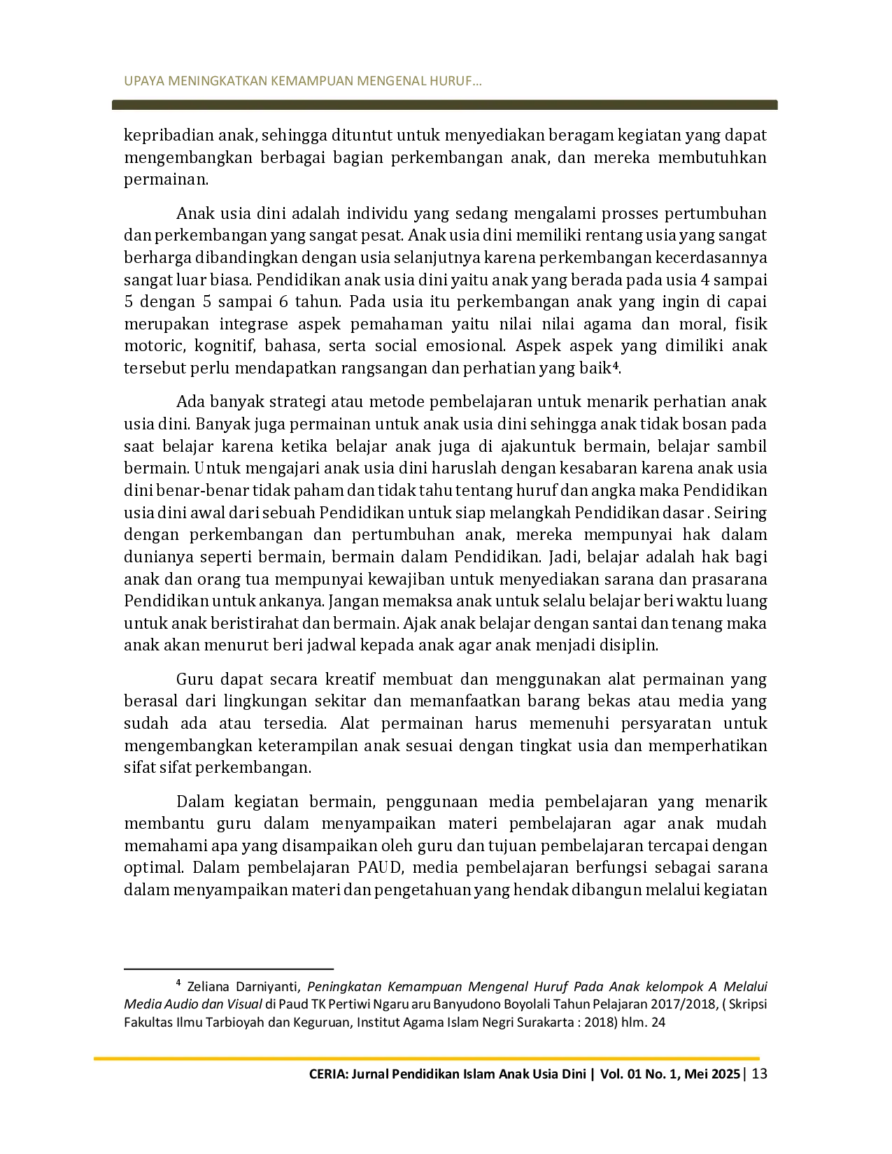 Ceria: Jurnal Pendidikan Islam Anak Usia DiniCeria: Jurnal Pendidikan Islam Anak Usia DiniPenelitian ini bertujuan untuk mengetahui penerapan media permainan mencari jejak (maze) pada anak kelompok B RA Al Fakhriyyah Jiken Blora dan untuk mengetahui hasil penggunaan media permainan mencari jejak (maze) pada anak kelompok B RA Al Fakhriyyah Jiken Blora. Penelitian ini menggunakan metode kualitatif dengan pendekatan fenomenologi. Hasil penelitian menunjukkan bahwa penerapan media permainan mencari jejak (maze) dapat meningkatkan kemampuan mengenal huruf pada anak kelompok B RA Al Fakhriyyah Jiken Blora.