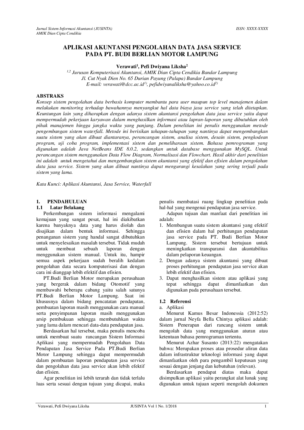 Jurnal JUSINTAJurnal JUSINTAKonsep sistem pengolahan data berbasis komputer membantu para user maupun top level manajemen dalam melakukan monitoring terhadap bawahannya menyangkut hal data biaya jasa service yang telah ditetapkan. Keuntungan lain yang diharapkan dengan adanya sistem akuntansi pengolahan data jasa service yaitu dapat mempermudah pekerjaan karyawan dalam menghasilkan informasi atau laporan-laporan yang dibutuhkan oleh pihak manajemen hingga jangka waktu yang panjang. Dalam penelitian ini penulis menggunakan metode pengembangan sistem waterfall. Metode ini berisikan tahapan-tahapan yang nantinya dapat mengembangkan suatu sistem yang akan dibuat diantaranya, perancangan sistem, analisa sistem, desain sistem, pengkodean program, uji coba program, implementasi sistem dan pemeliharaan sistem. Bahasa pemrograman yang digunakan adalah Java NetBeans IDE 8.0.2, sedangkan untuk database menggunakan MySQL. Untuk perancangan sistem menggunakan Data Flow Diagram, Normalisasi dan Flowchart. Hasil akhir dari penelitian ini adalah untuk mengetahui dan mengembangkan sistem akuntansi yang efektif dan efisien dalam pengolahan data jasa service. Sistem yang akan dibuat nantinya dapat mengurangi kesalahan yang sering terjadi pada sistem yang lama.