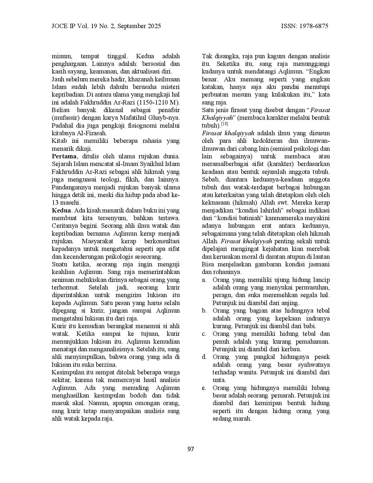 joce-ipjoce-ipAplikasi dengan menggunakan citra digital semakin banyak diminati. Saat ini penggunaan pembacaan karakter manusia untuk kepentingan Human Resource Development (HRD) semakin berkembang, antara lain karena tingginya persaingan dunia kerja dan kemajuan Artificial Intelligence (AI). Pembacaan karakter manusia melalui fisik sudah ada dalam literatur masa lalu. Beberapa peneliti telah mengembangkan citra digital untuk psikologi, namun belum secara spesifik mengarah pada citra psikologi yang memerlukan pengamatan lebih lanjut pada zonanya. Sistem pendukung pembacaan karakter manusia dengan menggunakan pengolahan citra digital merupakan solusinya. Sistem yang diusulkan menggunakan Deteksi Garis dan Deteksi Puncak untuk mendeteksi area tertentu pada citra hidung digital. Penelitian ini dilakukan terhadap beberapa model bentuk hidung berdasarkan literatur masa lalu, yaitu Kitab Firasat ArRazi.