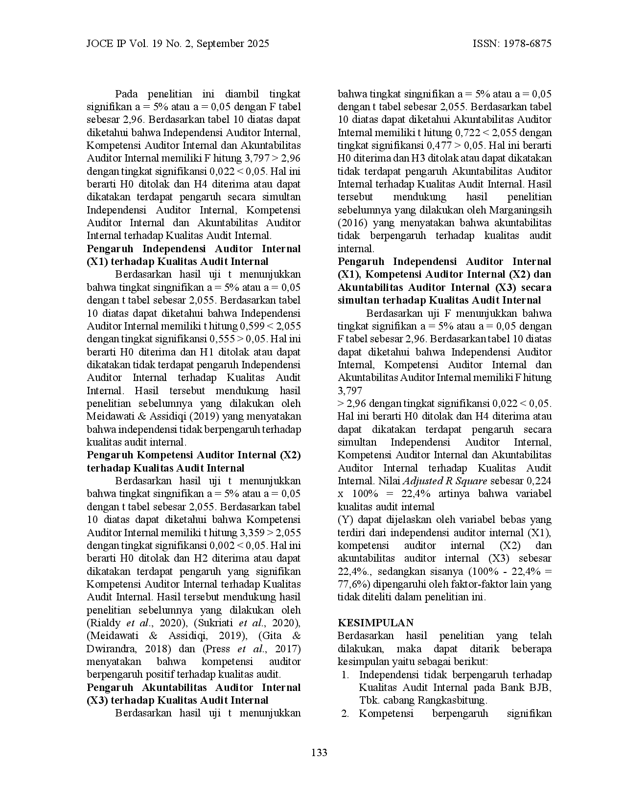 joce-ipjoce-ipAuditor internal memiliki peran penting dalam menjamin akuntabilitas dan transparansi pengelolaan keuangan regional, sehingga laporan keuangan harus transparan untuk memperlihatkan alokasi dana pemerintah. Auditor harus mempertahankan sikap independen guna menjaga kepercayaan publik, serta melaksanakan fungsi penting dalam mengelola dan mengawasi sektor keuangan demi menyediakan informasi yang akurat dan dapat diandalkan untuk pengambilan keputusan. Bank BJB didirikan untuk memenuhi kebutuhan masyarakat Jawa Barat dalam memaksimalkan penggunaan layanan perbankan, dengan kreativitas dan inovasi sebagai faktor utama dalam menghadapi persaingan industri perbankan yang semakin ketat. Penelitian ini berlatarkan fluktuasi jumlah karyawan dan auditor yang memengaruhi temuan audit di cabang Rangkasbitung, dan bertujuan menganalisis pengaruh independensi, kompetensi, dan akuntabilitas terhadap kualitas audit internal. Metode kuantitatif dengan sampel 30 auditor internal Bank BJB Tbk cabang Rangkasbitung menggunakan analisis statistik SPSS versi 26, menghasilkan temuan bahwa independensi tidak berpengaruh signifikan, kompetensi berpengaruh signifikan, dan akuntabilitas tidak berpengaruh signifikan terhadap kualitas audit internal, sementara ketiga variabel secara simultan memberikan pengaruh positif terhadap kualitas audit internal.