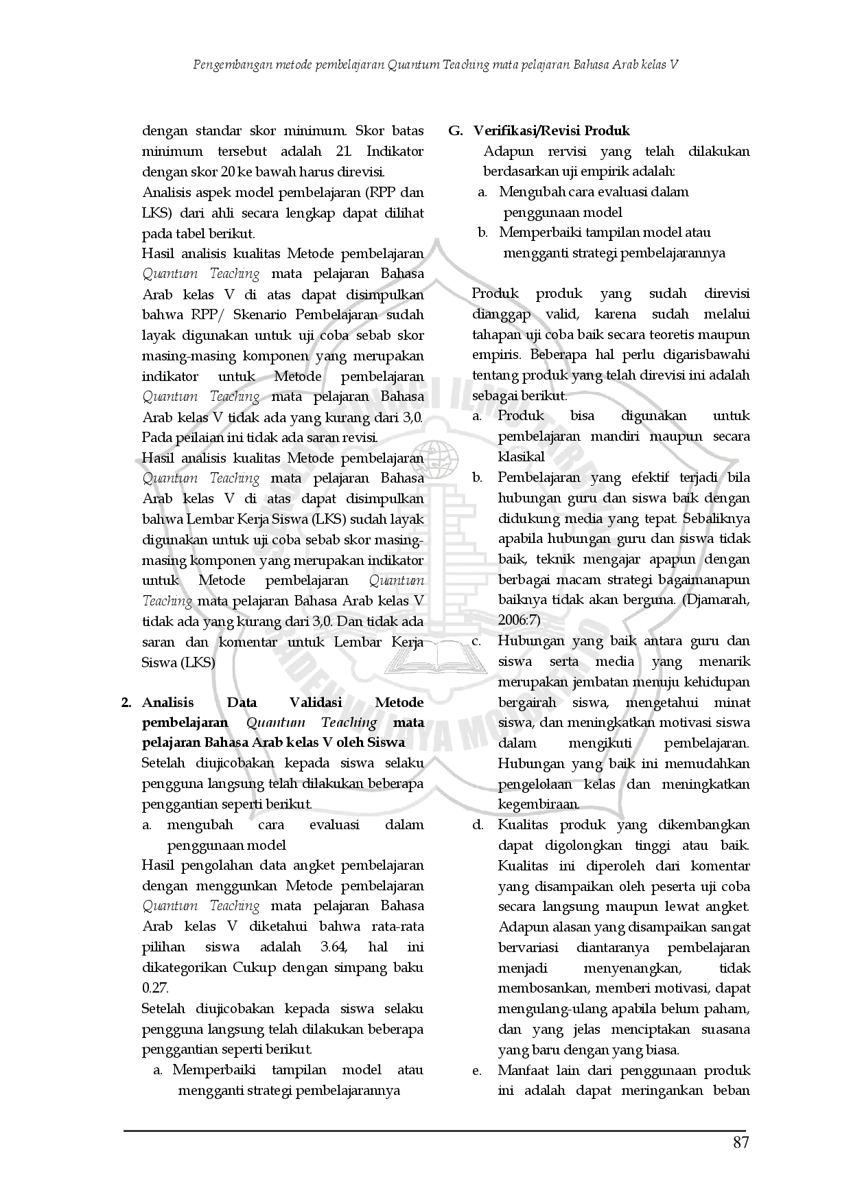 PROGRESSA: Journal of Islamic Religious InstructionPROGRESSA: Journal of Islamic Religious InstructionPenelitian ini bertujuan untuk mengembangkan metode pembelajaran Quantum Teaching pada mata pelajaran Bahasa Arab kelas V di MI Nurul Huda I Miji dan MI Nurul Huda 2 Surodinawan Kota Mojokerto. Quantum Teaching adalah strategi pembelajaran yang bertumpu pada prinsip-prinsip dan teknik-teknik Quantum Learning, yang mendukung prinsip bahwa pembelajaran adalah sebuah sistem. Produk yang dikembangkan meliputi manual metode pembelajaran Quantum Teaching. Hasil penelitian menunjukkan bahwa produk yang dikembangkan layak digunakan untuk meningkatkan hasil belajar Bahasa Arab kelas V.
