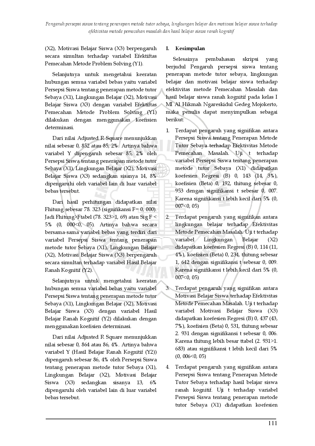 PROGRESSA: Journal of Islamic Religious InstructionPROGRESSA: Journal of Islamic Religious InstructionPenelitian ini bertujuan untuk mengetahui pengaruh persepsi siswa tentang penerapan metode tutor sebaya, lingkungan belajar, dan motivasi belajar siswa terhadap efektivitas metode pemecahan masalah dan hasil belajar siswa ranah kognitif. Hasil penelitian menunjukkan bahwa variabel persepsi siswa, lingkungan belajar, dan motivasi belajar secara signifikan berpengaruh terhadap efektivitas metode pemecahan masalah dan hasil belajar siswa ranah kognitif. Penelitian ini menggunakan metode kuantitatif dengan populasi siswa kelas I MI Al Hikmah Ngareskidul Gedeg Mojokerto.