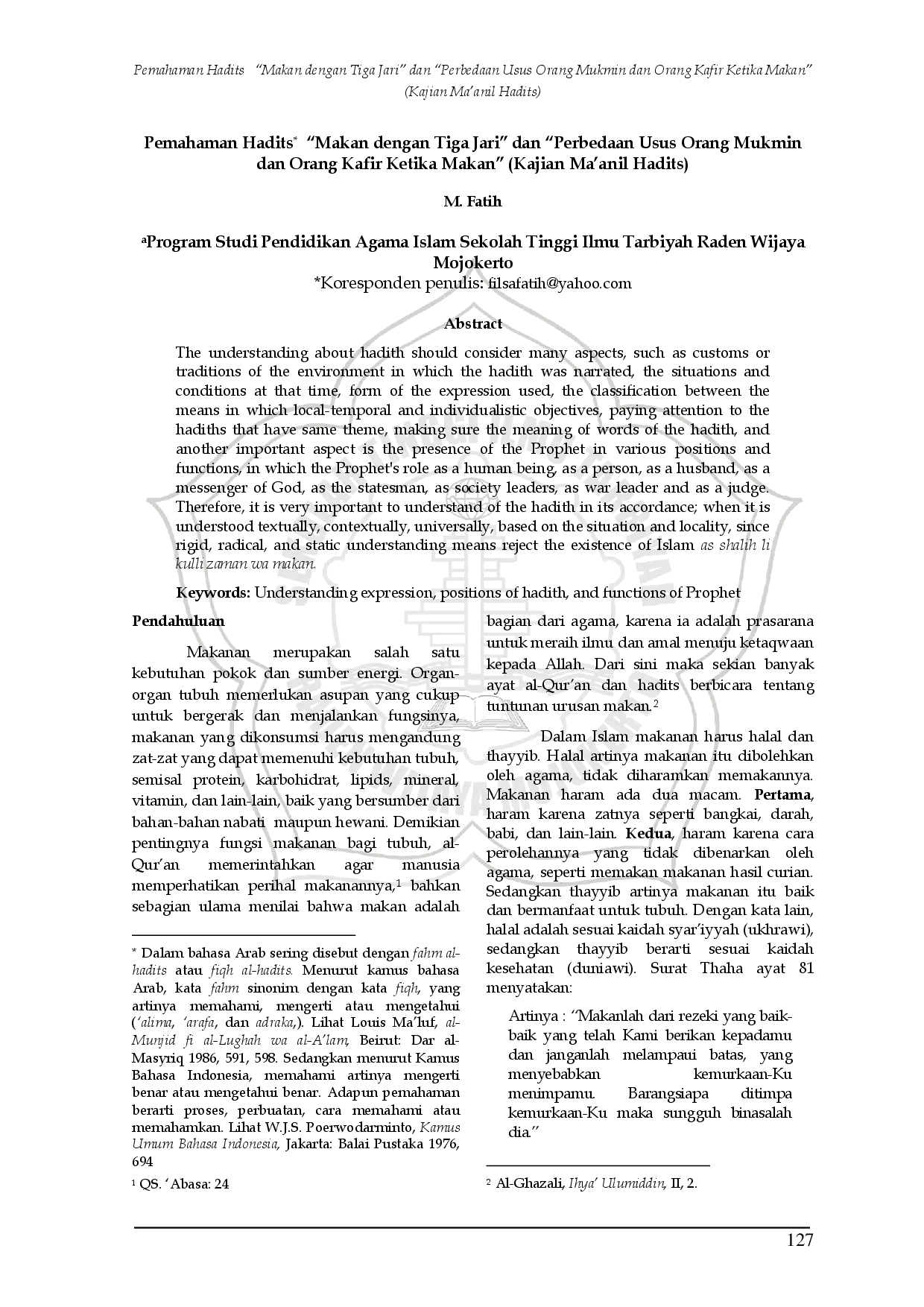 PROGRESSA: Journal of Islamic Religious InstructionPROGRESSA: Journal of Islamic Religious InstructionPemahaman tentang hadits harus mempertimbangkan banyak aspek, seperti kebiasaan atau tradisi lingkungan di mana hadits itu dinarasikan, situasi dan kondisi pada waktu itu, bentuk ungkapan yang digunakan, klasifikasi antara sarana yang lokal-temporal dan tujuan individu, memperhatikan hadis yang memiliki tema yang sama, memastikan makna kata-kata dalam hadis, dan aspek penting lainnya adalah keberadaan Nabi dalam berbagai posisi dan fungsi, di mana peran Nabi sebagai manusia, sebagai pribadi, sebagai suami, sebagai utusan Allah, sebagai kepala negara, sebagai pemimpin masyarakat, sebagai panglima perang, dan sebagai hakim. Oleh karena itu, sangat penting untuk memahami hadis sesuai konteksnya; ketika dipahami secara tekstual, kontekstual, universal, berdasarkan situasi dan lokalitas, karena pemahaman yang kaku, radikal, dan statis berarti menolak keberadaan Islam sebagai shalih li kulli zaman wa makan.