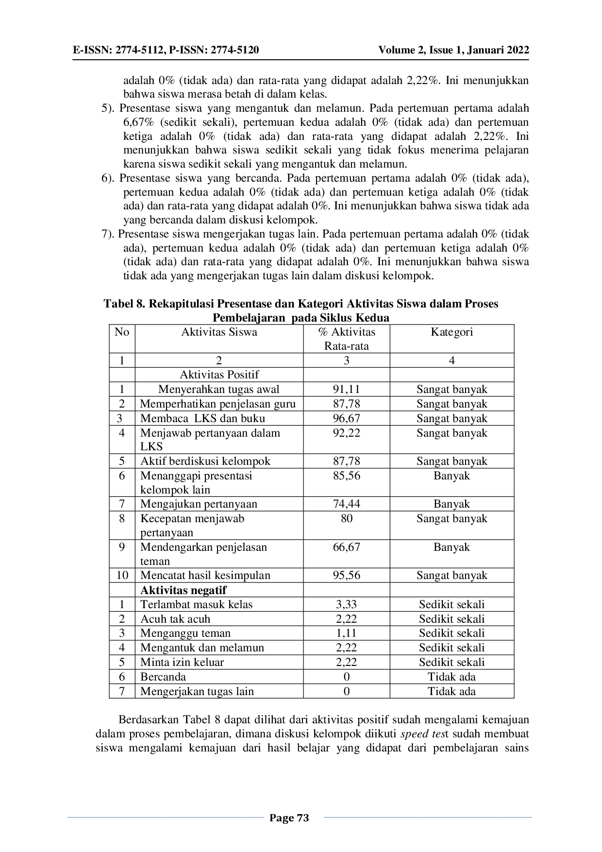Penggunaan metode diskusi kelompok diikuti speed test pada pembelajaran IPA dapat meningkatkan aktivitas belajar peserta didik kelas VII.Peningkatan ini terlihat dari aktivitas positif siswa yang semakin meningkat dan aktivitas negatif yang semakin menurun dari siklus pertama ke siklus kedua.Selain itu, hasil belajar siswa juga mengalami peningkatan yang signifikan setelah penerapan metode tersebut.