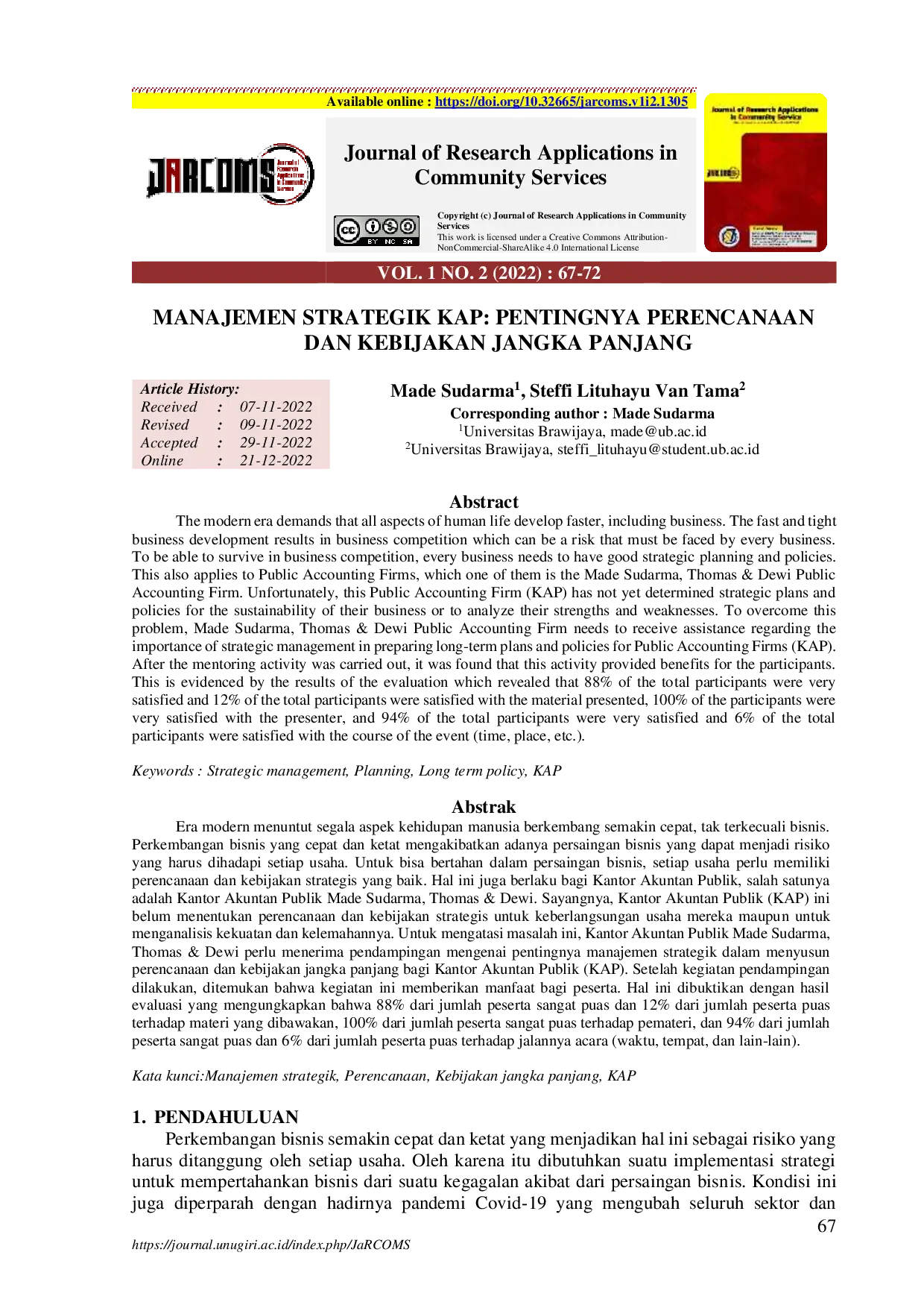 Journal of Research Applications in Community ServiceJournal of Research Applications in Community ServiceEra modern menuntut segala aspek kehidupan manusia berkembang semakin cepat, tak terkecuali bisnis. Perkembangan bisnis yang cepat dan ketat mengakibatkan adanya persaingan bisnis yang dapat menjadi risiko yang harus dihadapi setiap usaha. Untuk bisa bertahan dalam persaingan bisnis, setiap usaha perlu memiliki perencanaan dan kebijakan strategis yang baik. Hal ini juga berlaku bagi Kantor Akuntan Publik, salah satunya adalah Kantor Akuntan Publik Made Sudarma, Thomas & Dewi. Sayangnya, Kantor Akuntan Publik (KAP) ini belum menentukan perencanaan dan kebijakan strategis untuk keberlangsungan usaha mereka maupun untuk menganalisis kekuatan dan kelemahannya. Untuk mengatasi masalah ini, Kantor Akuntan Publik Made Sudarma, Thomas & Dewi perlu menerima pendampingan mengenai pentingnya manajemen strategik dalam menyusun perencanaan dan kebijakan jangka panjang bagi Kantor Akuntan Publik (KAP). Setelah kegiatan pendampingan dilakukan, ditemukan bahwa kegiatan ini memberikan manfaat bagi peserta. Hal ini dibuktikan dengan hasil evaluasi yang mengungkapkan bahwa 88% dari jumlah peserta sangat puas dan 12% dari jumlah peserta puas terhadap materi yang dibawakan, 100% dari jumlah peserta sangat puas terhadap pemateri, dan 94% dari jumlah peserta sangat puas dan 6% dari jumlah peserta puas terhadap jalannya acara (waktu, tempat, dan lain-lain).