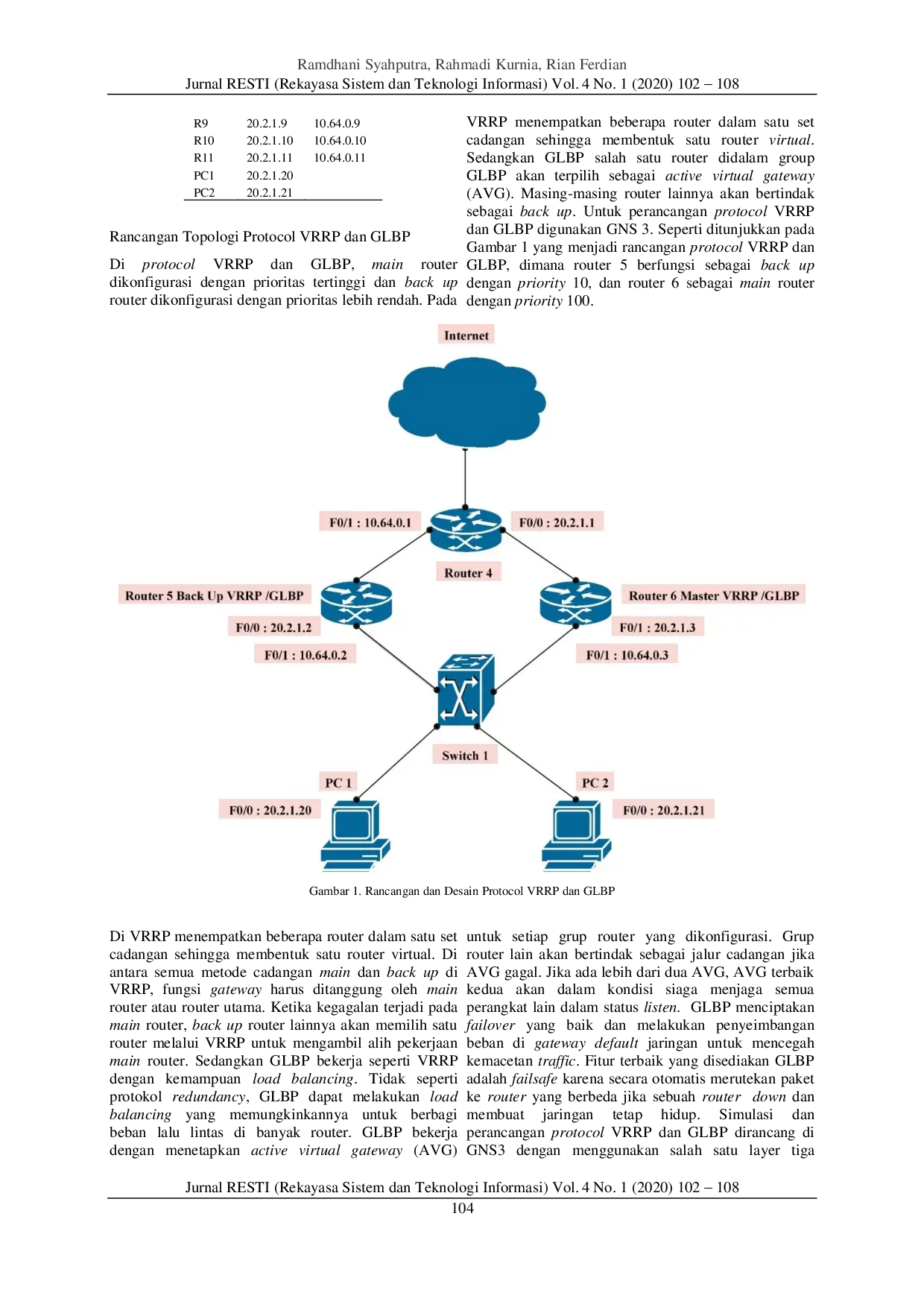 Jurnal RESTI (Rekayasa Sistem dan Teknologi Informas)iJurnal RESTI (Rekayasa Sistem dan Teknologi Informas)iKeandalan data akses yang tinggi telah menjadi satu masalah yang dihadapi banyak perusahaan, lembaga, dan universitas. Karena alasan ini, diperlukan protokol yang dapat menjaga jaringan dari terputusnya komunikasi. Salah satu metode yang digunakan untuk mempertahankan komunikasi dengan menerapkan sistem protocol redundancy. Satu atau lebih router akan bertindak sebagai main router untuk load balancing dan beberapa router dalam mode stand by jika salah satu router utama down. First hop redundancy protocols (FHRP) merupakan protokol yang mengimplementasikan sistem redudancy dan load balancing. Protokol ini mampu mentransfer lalu lintas data akses jika salah satu router di jaringan down. FHRP dibagi menjadi virtual router redundancy protocol (VRRP) dan gateway load balancing protocol (GLBP). Penelitian ini menganalisis perancangan dan implementasi untuk memberikan informasi tentang kualitas layanan VRRP dan GLBP di router utama dan router cadangan, dengan menggunakan aplikasi graphical network simulator (GNS) 3. Di aplikasi GNS3 dirancang sebuah topologi jaringan LAN dengan delapan perangkat router berbentuk topologi ring menggunakan protocol RIPv2 dan OSPF, kemudian diimplementasikan ke protocol VRRP dan GLBP. Hasil analisa didapatkan bahwa GLBP dapat melakukan back up jaringan lebih cepat dari pada VRRP ketika router utama down. Apabila diimplementasikan ke sebuah jaringan LAN dengan protocol routing RIPv2 dan OSPF, VRRP memiliki kualitas layanan yang lebih baik dari pada GLBP.
