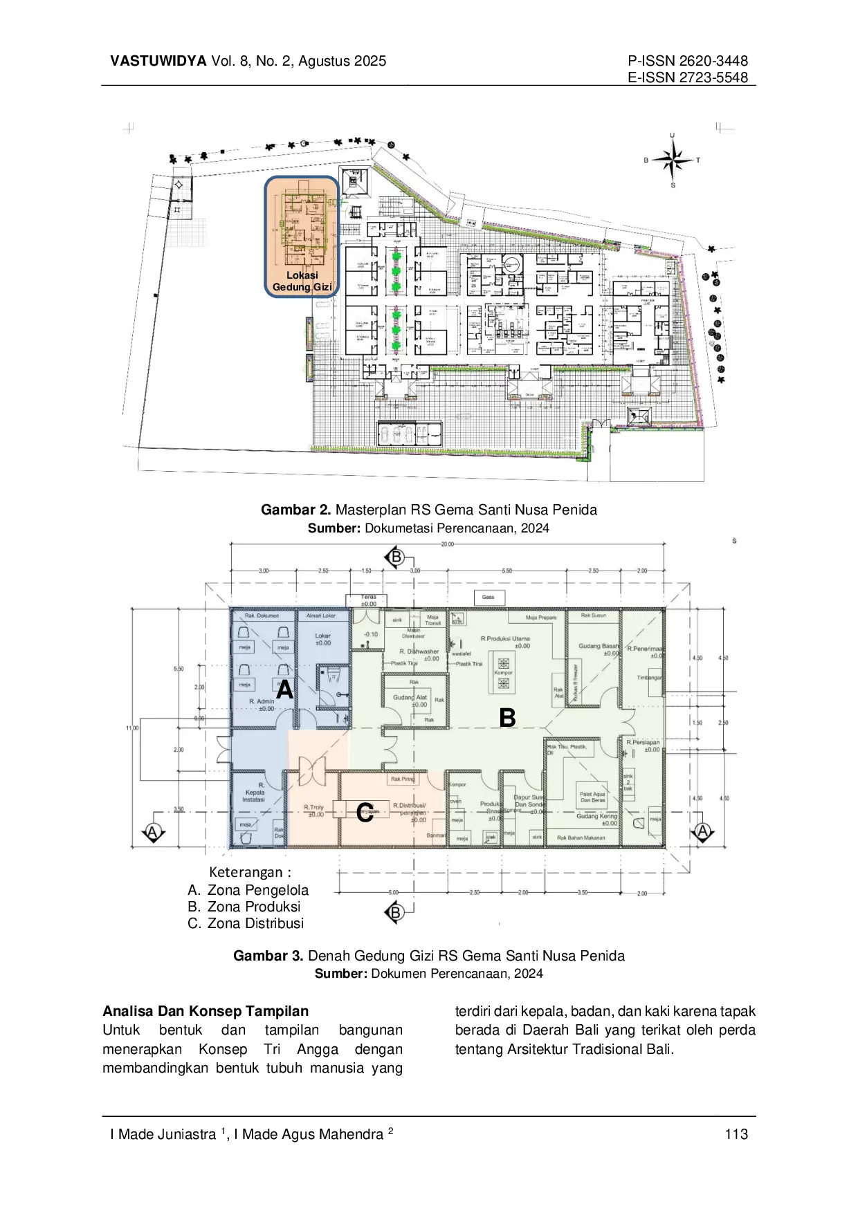 Jurnal Ilmiah VastuwidyaJurnal Ilmiah VastuwidyaNusa Penida adalah sebuah pulau yang terletak di Kabupaten Klungkung, Provinsi Bali. Nusa Penida merupakan pulau dengan penduduk yang banyak memerlukan fasilitas pelayanan kesehatan berupa rumah sakit dengan pelayanan lengkap dan terpadu dengan kondisi baik dan layak operasional, agar masyarakat Nusa Penida yang hendak mencari pengobatan yang lebih lengkap dan terpadu tidak harus menyeberangi lautan lagi menuju ke Klungkung daratan. Rumah Sakit Gema Santi adalah RSUD yang ada di Nusa Penida yang didirikan dan terus dikembangkan oleh Pemerintah Daerah Klungkung secara berkelanjutan dengan perencanaan yang terpadu. Perancangan gedung gizi merupakan salah satu target pembangunan tahun berjalan. Perencanaan gedung gizi merupakan proyek pemerintah yang direncanakan agar menjadi satu kesatuan saling melengkapi dengan fasilitas yang sudah ada di Rumah Sakit Gema Santi, serta dengan pertimbangan budget yang dianggarkan oleh pemerintah daerah untuk pembangunan fisik gedungnya. Dalam desain tata ruang dan tampilan bangunan tetap menerapkan peraturan Pemerintah Provinsi Bali tentang pelestarian arsitektur tradisional Bali dengan tetap menerapkan kaidah bangunan tropis dengan pencahayaan dan penghawaan alami. Dalam pemilihan material juga harus menerapkan peraturan pemerintah tentang kandungan produksi dalam negeri. Sehingga dengan batasan anggaran dan kondisi site tetap didapat desain bangunan yang seimbang dan layak antara fungsi bangunan gedung gizi dengan biaya yang dianggarkan.