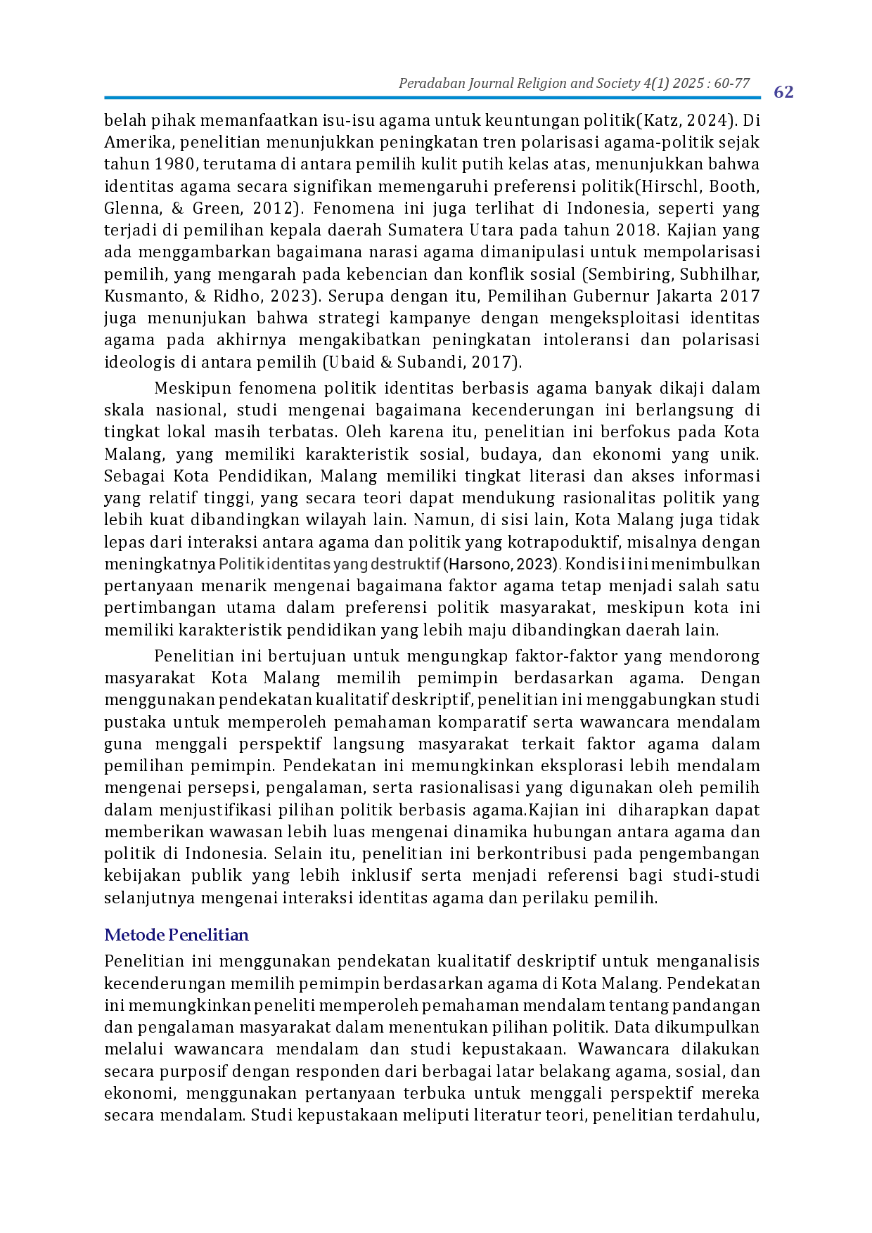 Peradaban Journal of Religion and SocietyPeradaban Journal of Religion and SocietyPenelitian ini bertujuan untuk mengkaji faktor-faktor yang mendorong masyarakat Kota Malang dalam memilih pemimpin berdasarkan agama. Penelitian ini menggabungkan studi pustaka dan wawancara mendalam untuk menggali perspektif masyarakat mengenai peran agama dalam pemilihan pemimpin. Hasil penelitian menunjukkan bahwa mayoritas masyarakat Kota Malang cenderung memilih pemimpin yang seagama. Meskipun demikian, terdapat kecenderungan yang berkembang, terutama di kalangan generasi muda, untuk lebih mempertimbangkan kompetensi dan integritas dibanding sekadar latar belakang agama. Sedangkan sebagian masyarakat, terutama dari kelompok yang lebih tua dan konservatif, tetap berpegang pada keyakinan bahwa pemimpin seagama lebih dapat dipercaya dalam menjalankan kebijakan yang sesuai dengan nilai-nilai agama mereka. Kajian ini juga menunjukkan bahwa agama memainkan peran signifikan dalam preferensi politik masyarakat Kota Malang, di mana mayoritas pemilih cenderung memilih calon pemimpin yang memiliki latar belakang agama yang sama. Keputusan ini didorong oleh keyakinan bahwa pemimpin seagama lebih memahami kebutuhan spiritual dan lebih mampu mewakili kepentingan komunitas mereka. Namun, kecenderungan ini juga menimbulkan tantangan terkait inklusi, keadilan, dan kohesi sosial. Karena kecenderungan memilih pemimpin berdasarkan agama erat kaitannya dengan politik identitas, di mana agama menjadi faktor utama dalam mobilisasi politik. Politik identitas ini berpotensi memperkuat polarisasi dan fragmentasi sosial, serta menghambat integrasi sosial. Selain itu, pemilihan pemimpin yang eksklusif berdasarkan agama dapat mengabaikan faktor-faktor penting seperti kompetensi dan integritas.